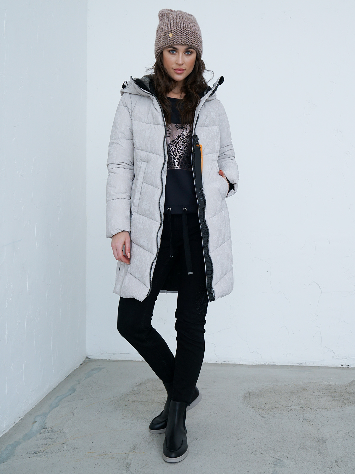 Стеганое однотонное пальто с синтепоном наполнителем. Контрастная молния. Объемный капюшон, боковые карманы с листочкой.