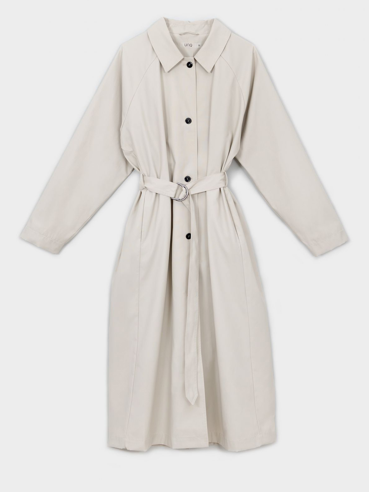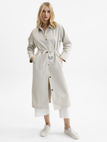 Однотонный легкий тренч на пуговицах. Рукава реглан полной длины. Отложной рубашечный воротник. В комплекте идет пояс из основного материала изделия.