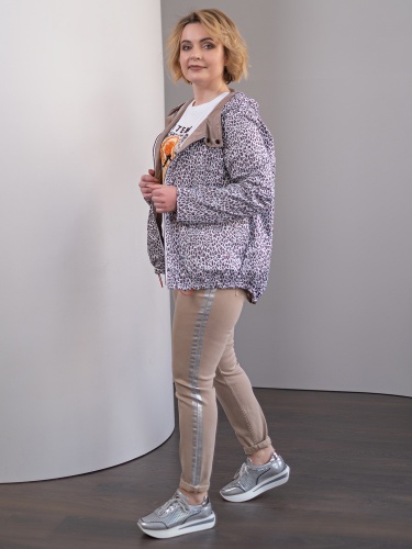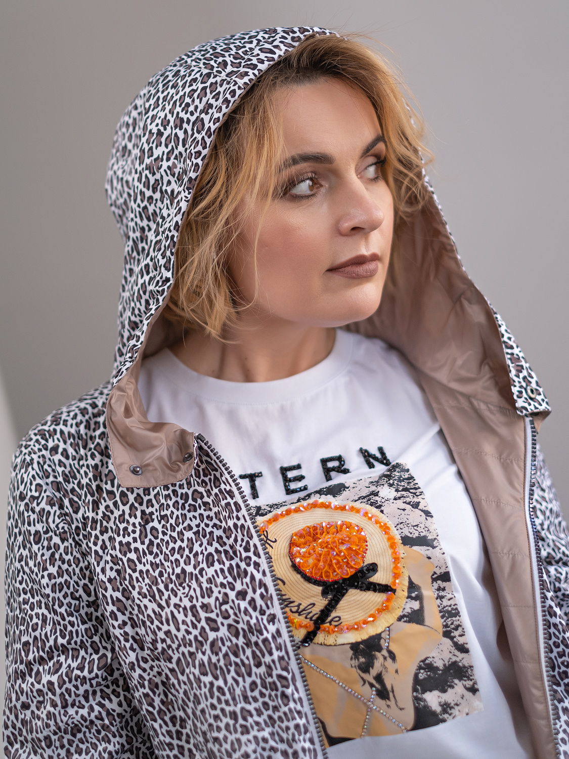 Куртка свободного силуэта выполнена в анималистичном принте. Застежка-молния. Втачной рукав полной длины Глубокий капюшон. Кулиска по низу изделия.