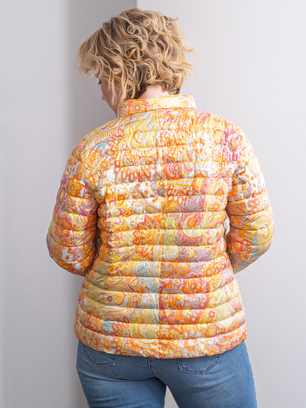 Стеганая куртка в ярком узоре. Воротник-стойка, застежка-молния. Прорезные карманы на молнии. Втачной рукав полной длины. Куртка прекрасно завершит яркий образ в городском повседневном стиле.