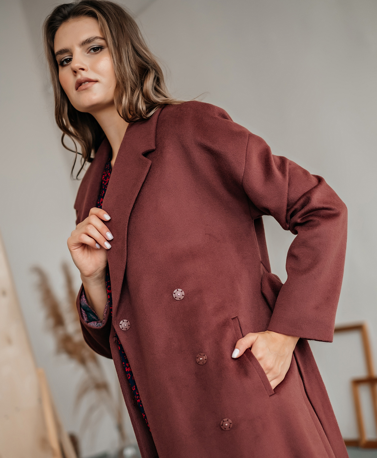Пальто прямого силуэта длиной выше колена. Втачной рукав, застёжка на пришивные кнопки, английский воротник, горизонтальный подрез на полочке и спинке, вертикальные карманы-листочки.