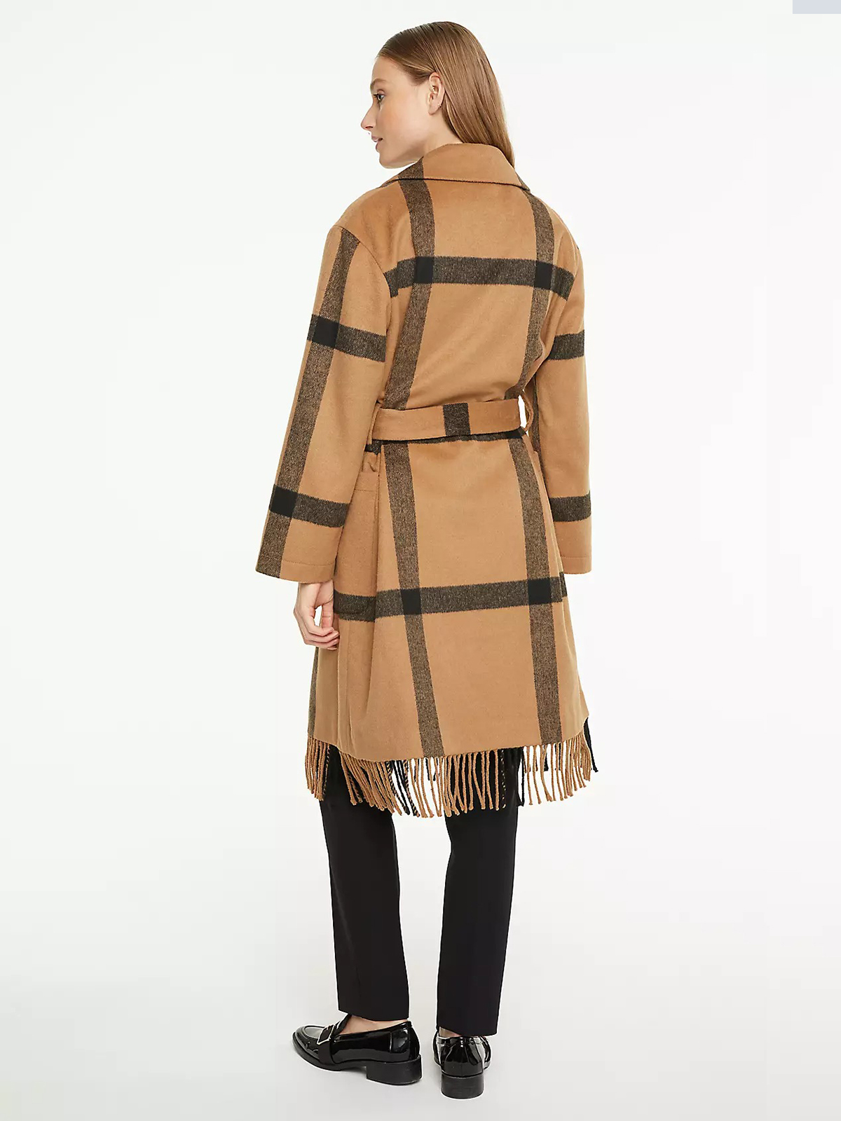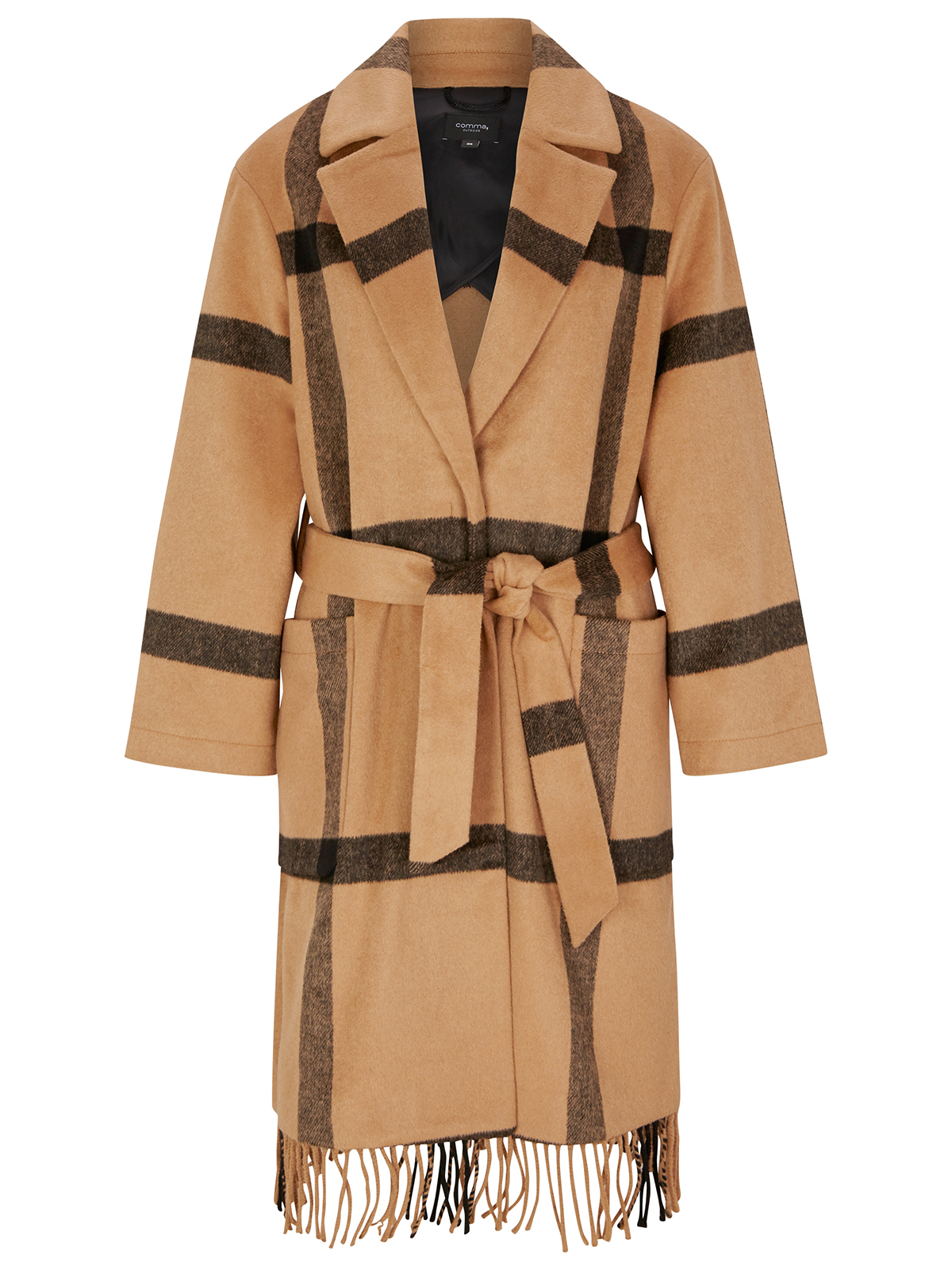 Пальто-халат в крупную клетку. Стильная деталь в виде бахромы по низу изделия. Отложной воротник с лацканами, длинный втачной рукав. В комплекте идет пояс из основного материала изделия.