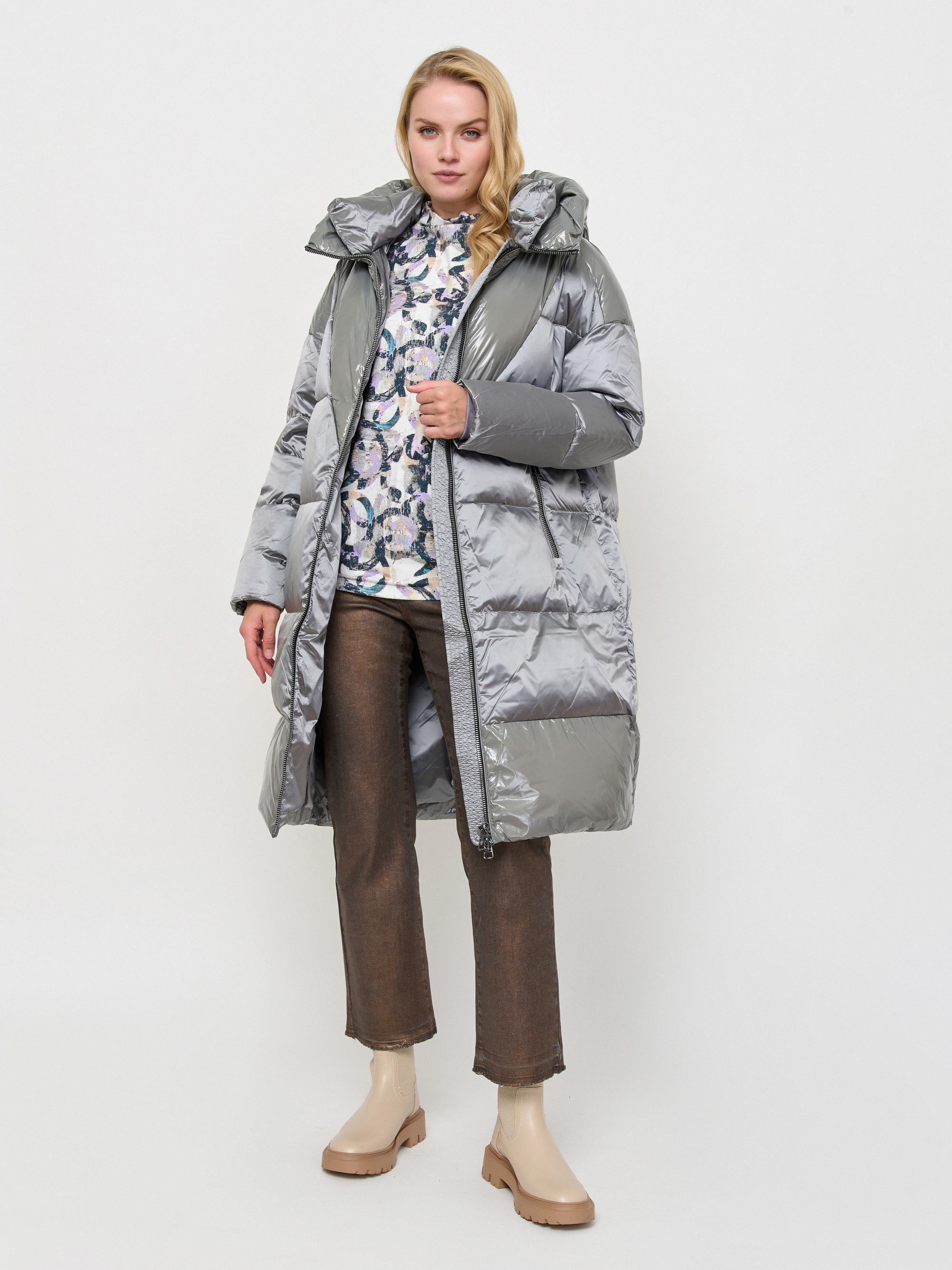 Комбинированное пальто рассчитано на температурный режим от -5 до -20°C. Ткань верха 1 - 60% полиэстер, 40% нейлон с метализированным эффектом; ткань верха 2 - 100% полиэстер с виниловой накаткой; подкладка - 60% полиэстер, 40% нейлон с метализированным эффектом; утеплитель - 90% пух / 10% перо. Детали: пальто-пуховик, застежка молния, опции капюшона несъемный капюшон, рукава длинные, покрой прямой, без рисунка, утеплитель пух, карманы прорезные, без опушки, борты однобортное.