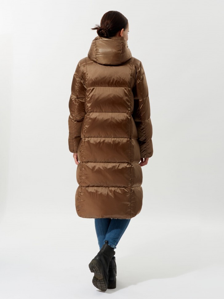 Пальто женское двустороннее прямого силуэта выполнено из водоотталкивающей ткани с матовым сатиновым покрытием. Застежка по борту на молнии, карманы листочки и на потайных молниях. Втачной капюшон с кулиской и декоративной тесьмой. Утеплитель: 90% натуральный пух, 10% перо.