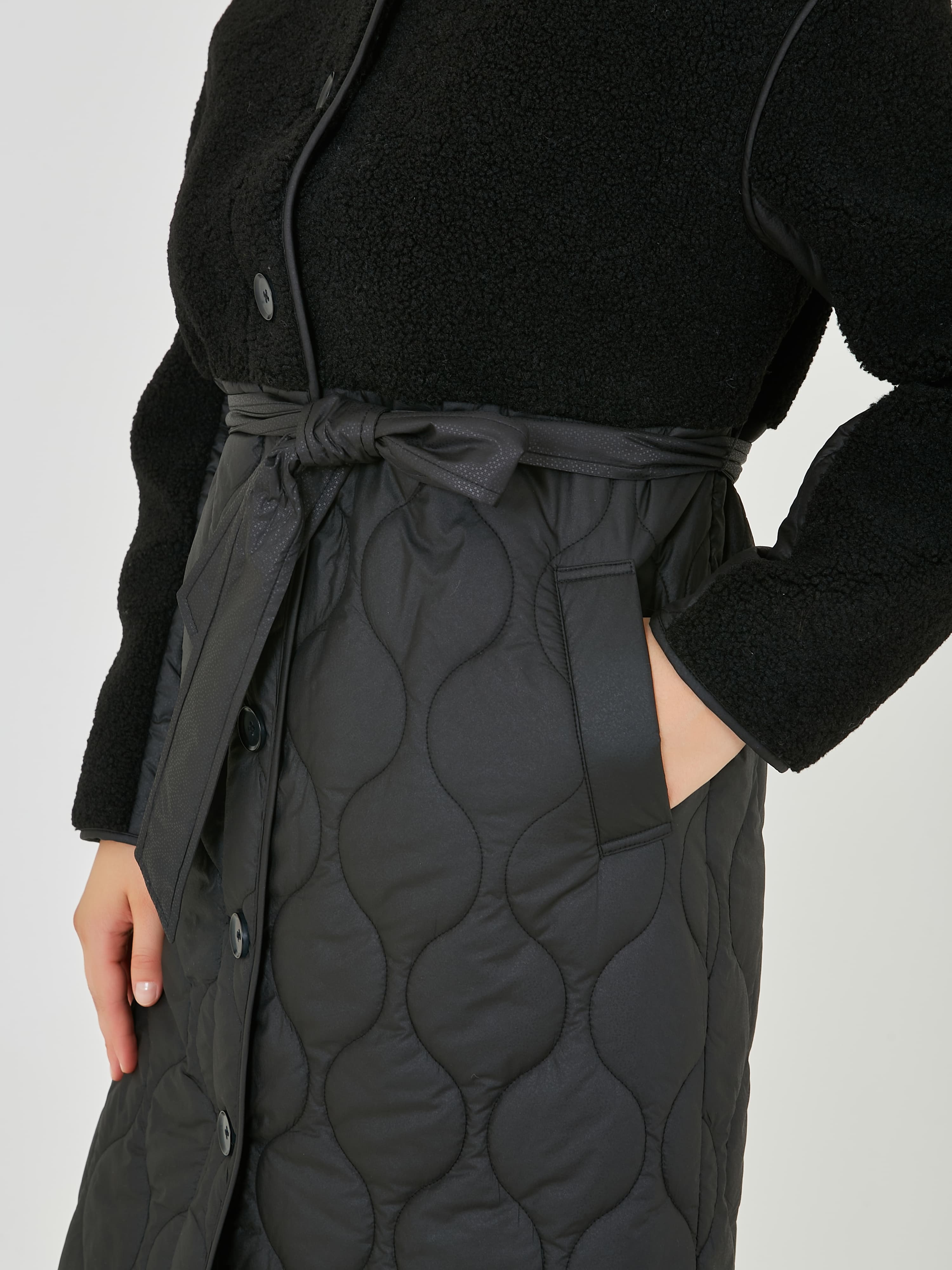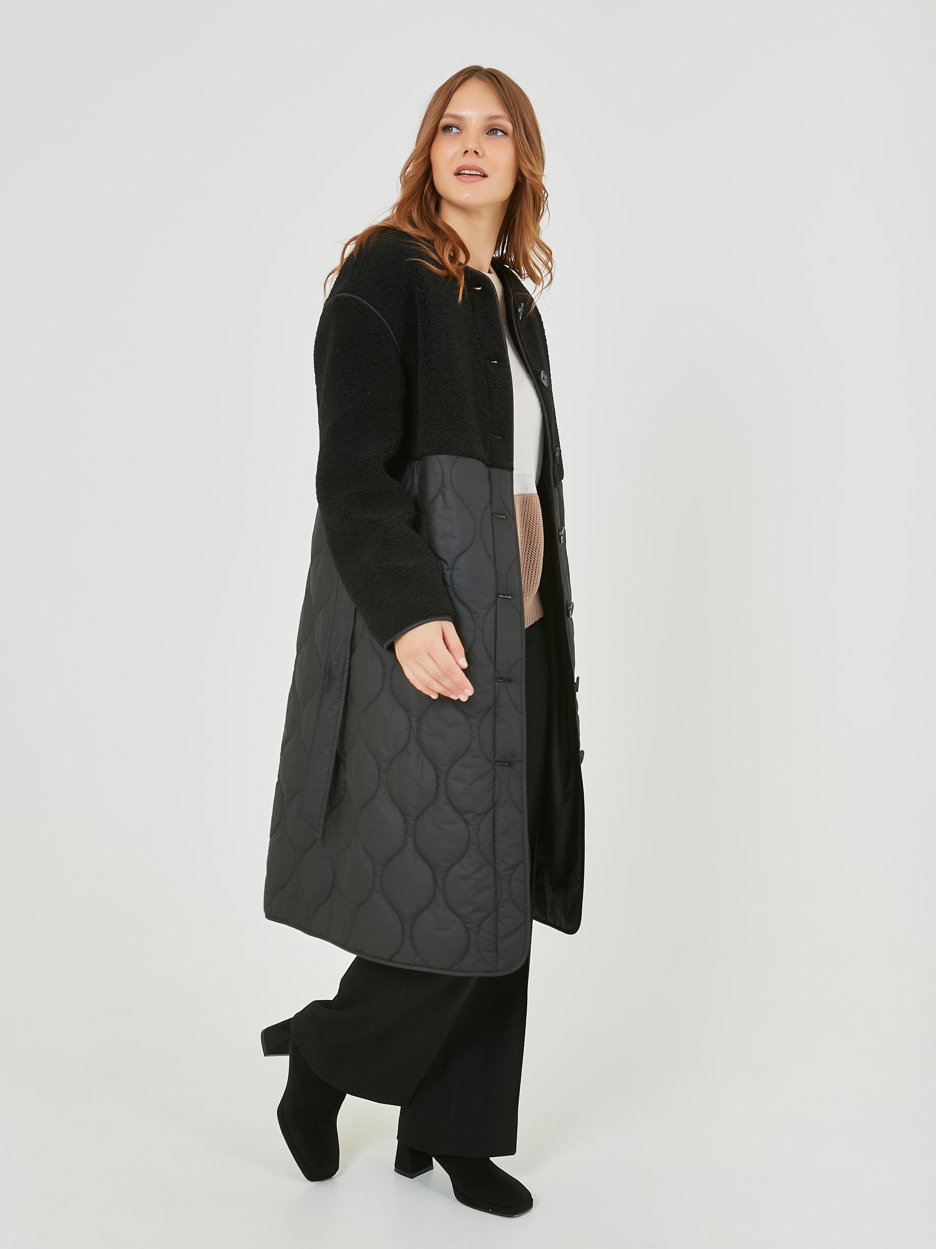 Пальто прямого кроя с крупными пуговицами сочетает мягкий светлый материал в верхней части с бежевым стеганым низом, придающим тепло и уют.Осень-Зима'25/26. Капсула "Вишневый сад". Параметры модели: 95-64-101, рост 175, размер 44-46