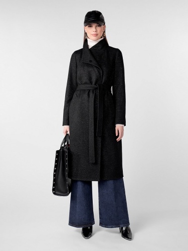 Пальто полуприлегающего силуэта длиной ниже колена. Втачной рукав, застёжка на пришивные кнопки, воротник-стойка, рельефы на полочке, карманы-листочки, пояс, шлица в среднем шве спинки. Изделие декорировано тамбурной строчкой. Произведено с ветрозащитной мембраной Raft Pro. Утепленная спинка по технологии Eurowinter. Утеплитель из биопуха DuPont Sorona. Изготовлено из шерстяного твида чёрного цвета с люрексом.