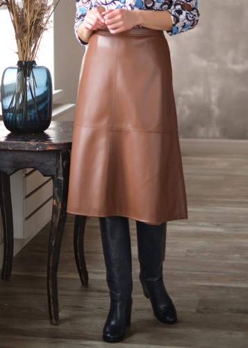 Однотонная юбка-трапеция из экокожи. Длина миди, боковые карманы, сзади замок-молния.
