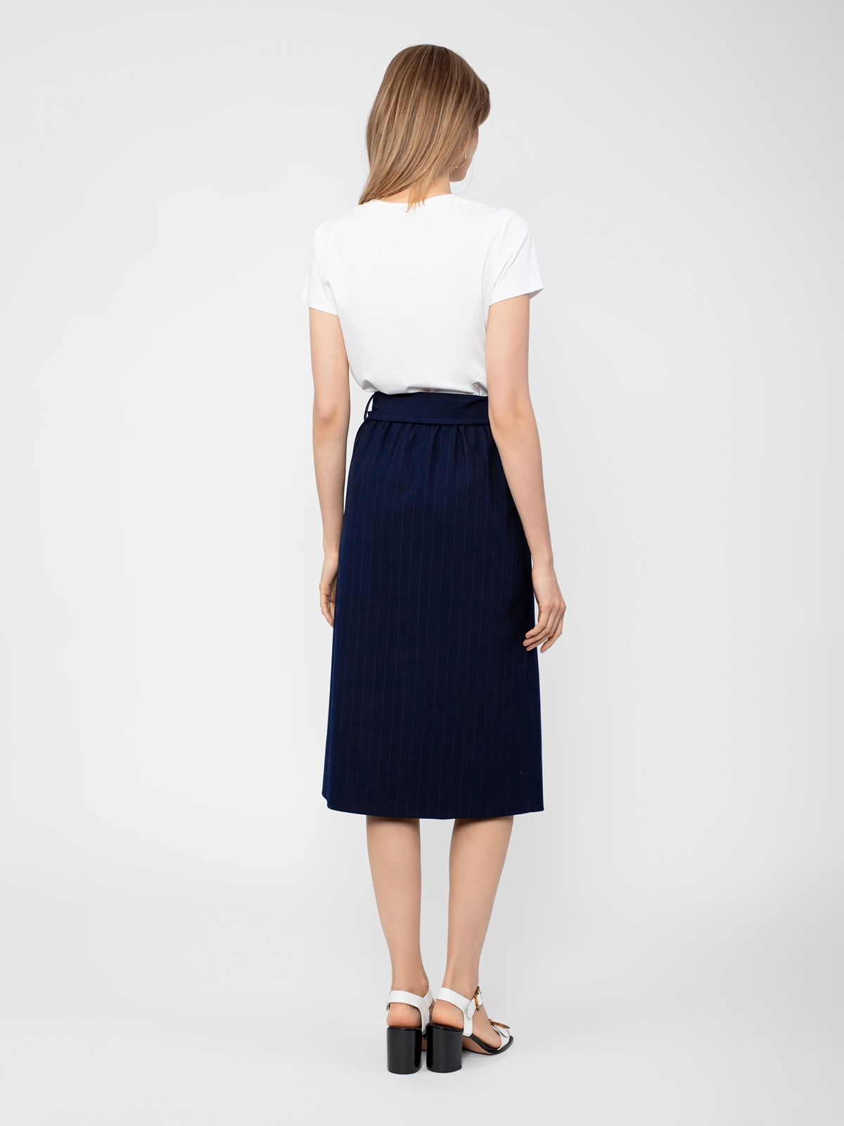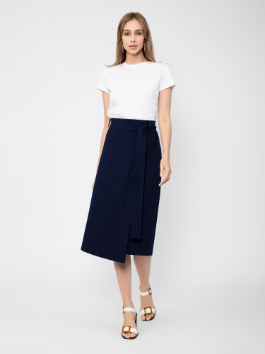 Юбка из костюмной ткани в полоску силуэта трапеция на притачном поясе со шлевками. Спереди декоративный запах треугольной формы. Сзади пояс на резинке. В комплект входит широкий съемный пояс из основной ткани.