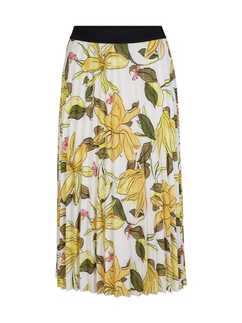 Плиссированная юбка длины миди выполнена в цветочном узоре. Эластичный пояс контрастного цвета обеспечивает удобство ношения. Юбка отлично сочетается с футболкой или топом.