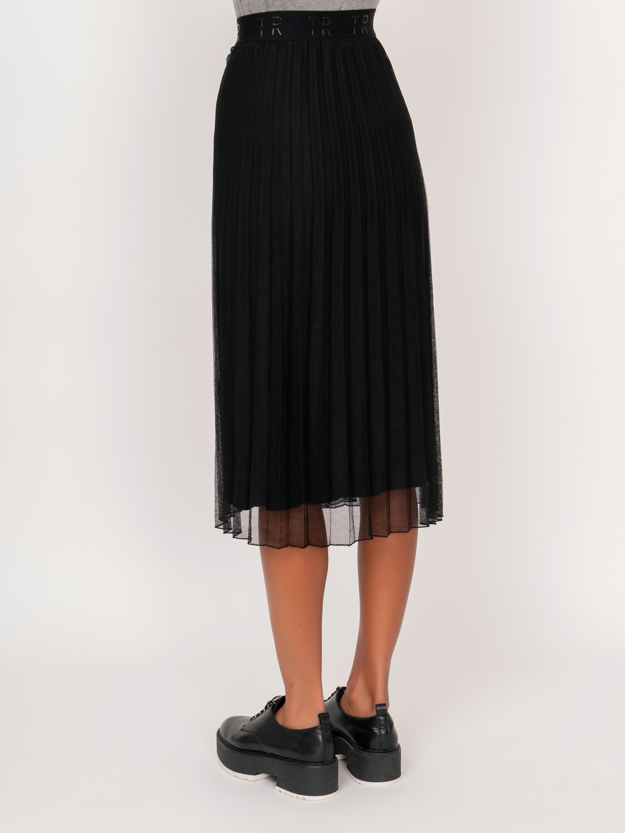 На сайте указаны российские размеры. Черная плиссированная миди юбка трапеция на резинке. Рост модели: 175 см. Длина юбки: 70 см.