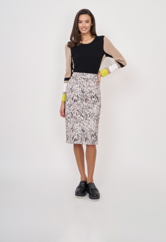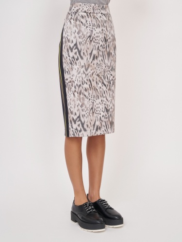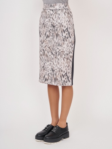 На сайте указаны российские размеры. Прямая трикотажная миди юбка на резинке с леопардовым рисунком и полосками. Длина по спинке: 60 см. Рост модели: 175 см.