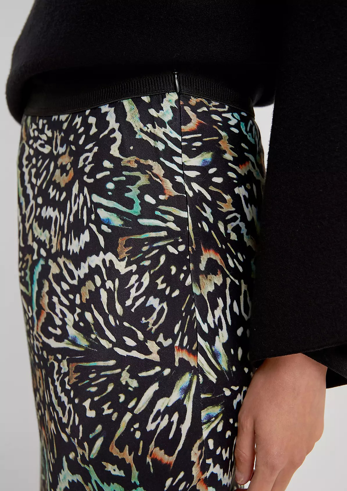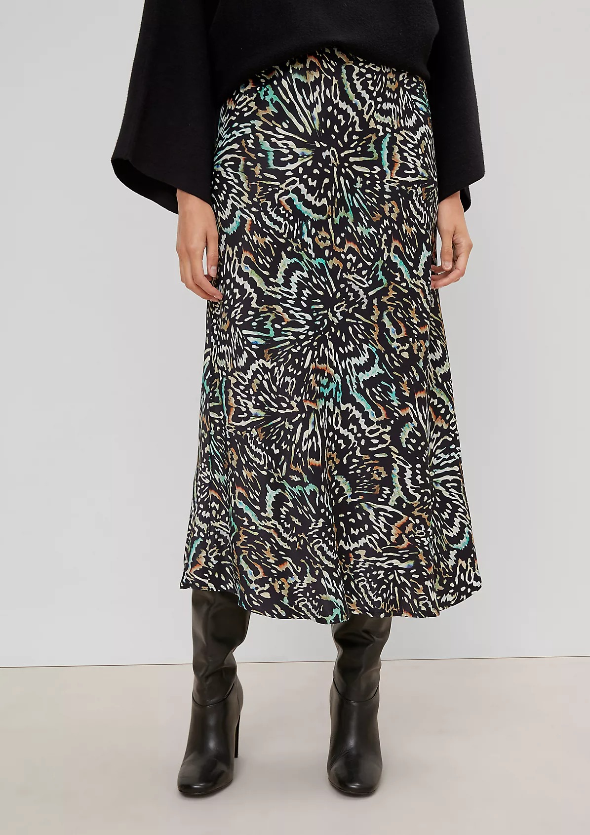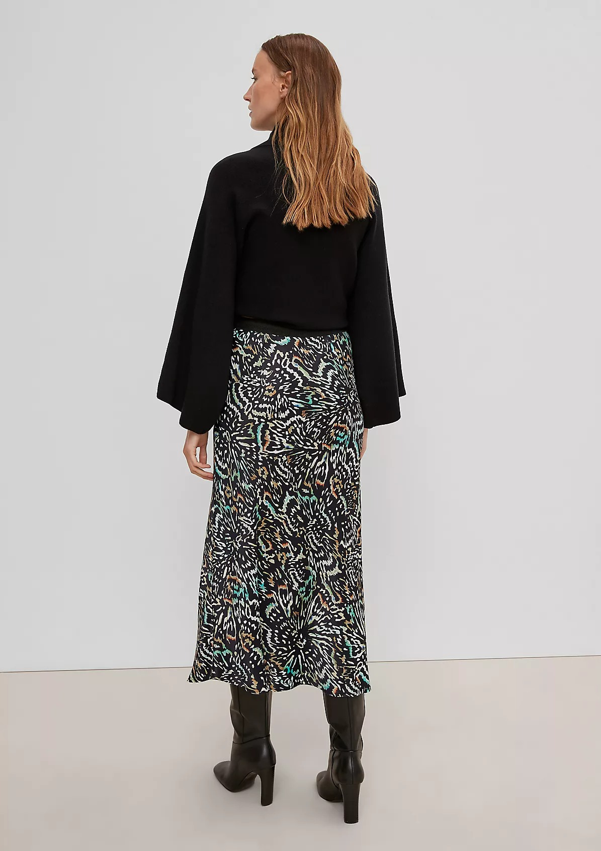 На сайте указаны российские размеры. Атласная юбка со сплошным принтом длины миди. Эластичный пояс. Длина спины: 73,5 см в размере 42. Рост модели 178 см