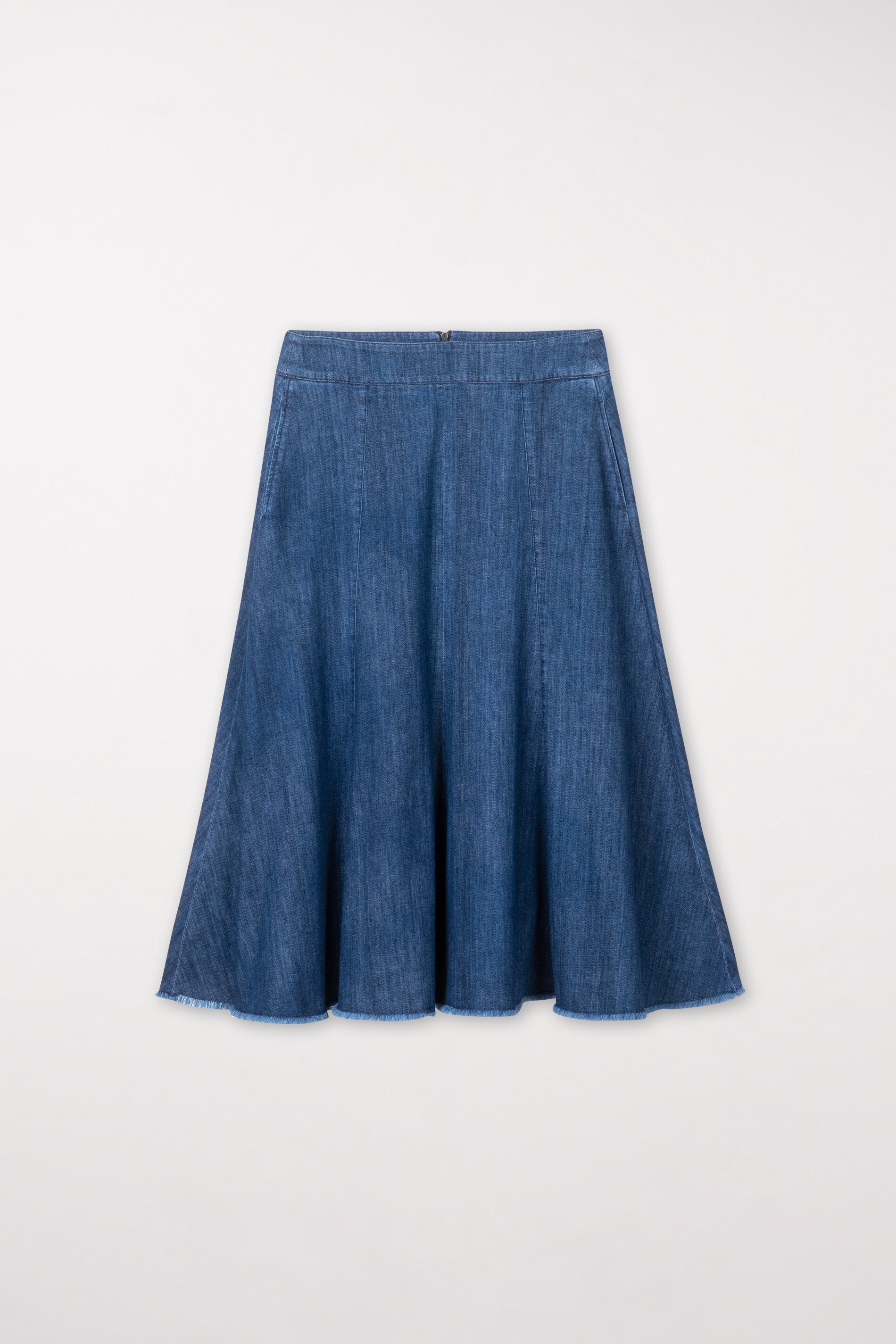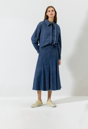 На сайте указаны российские размеры. Юбка-годе средней длины из натуральной легкой эластичной джинсовой ткани с эффектом потертости и молнией сзади. Нижний край украшен тонкой бахромой. Рост модели 178 см