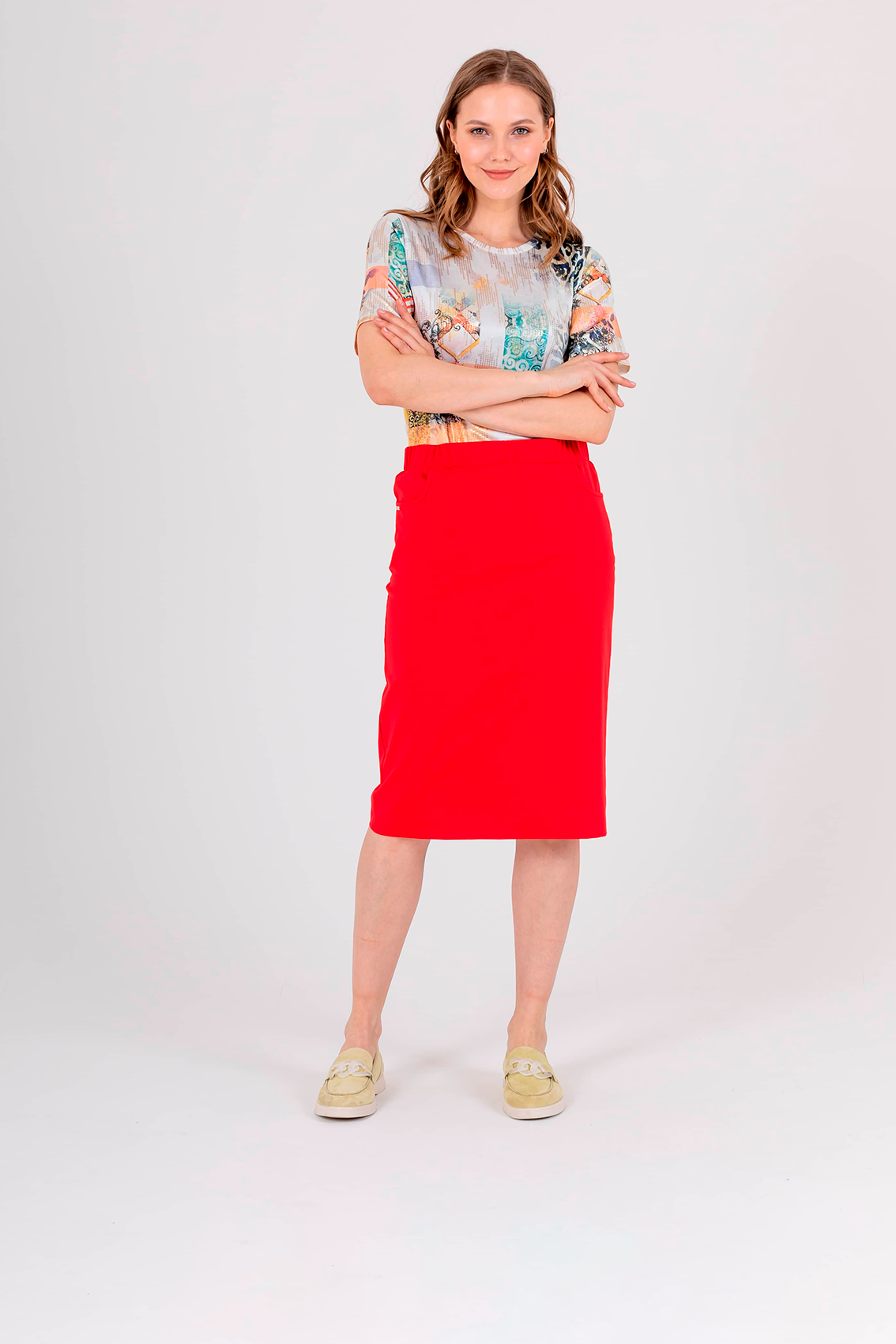 Яркая юбка-карандаш длиной ниже колена из полиэстера с добавлением мягкой вискозы и эластана. На переднем полотнище юбки расположены два кармана с отрезным бочком. Верх юбки обработан поясом на резинке.