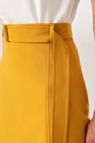 Юбка прямого силуэта на подкладке, выполнена из костюмного полотна. Притачной пояс со шлевками. Спереди выполнен деликатный разрез. Дополняется поясом из основного полотна с прямоугольными пряжками.