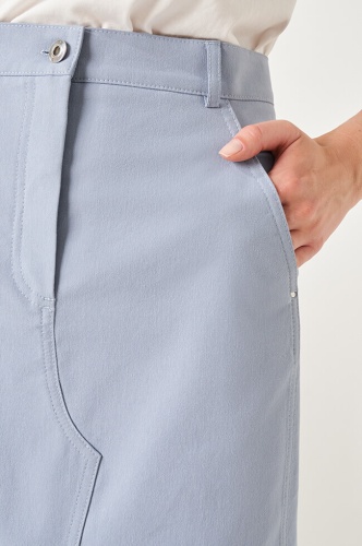 Прямая юбка миди из денима. Притачной пояс со шлевками. Застежка на молнию и пуговицу. Спереди косые боковые карманы. Спереди фигурный центральный шов заканчивается разрезом. Спинка с кокеткой и накладными карманами.