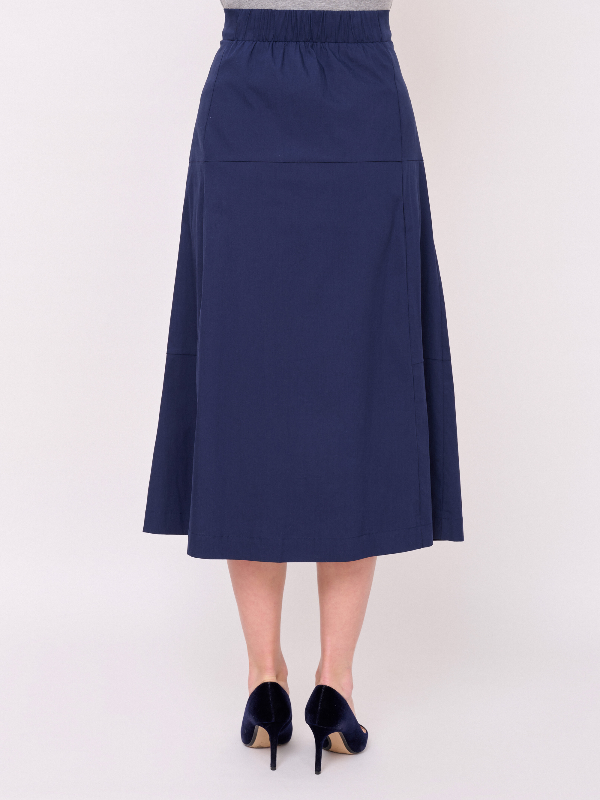 Без застежки, пояс на резинке, покрой расклешенный, посадка средняя, без рисунка, без карманов, конструктивные элементы хлястики, модель юбки расклешенная, длина юбки миди.