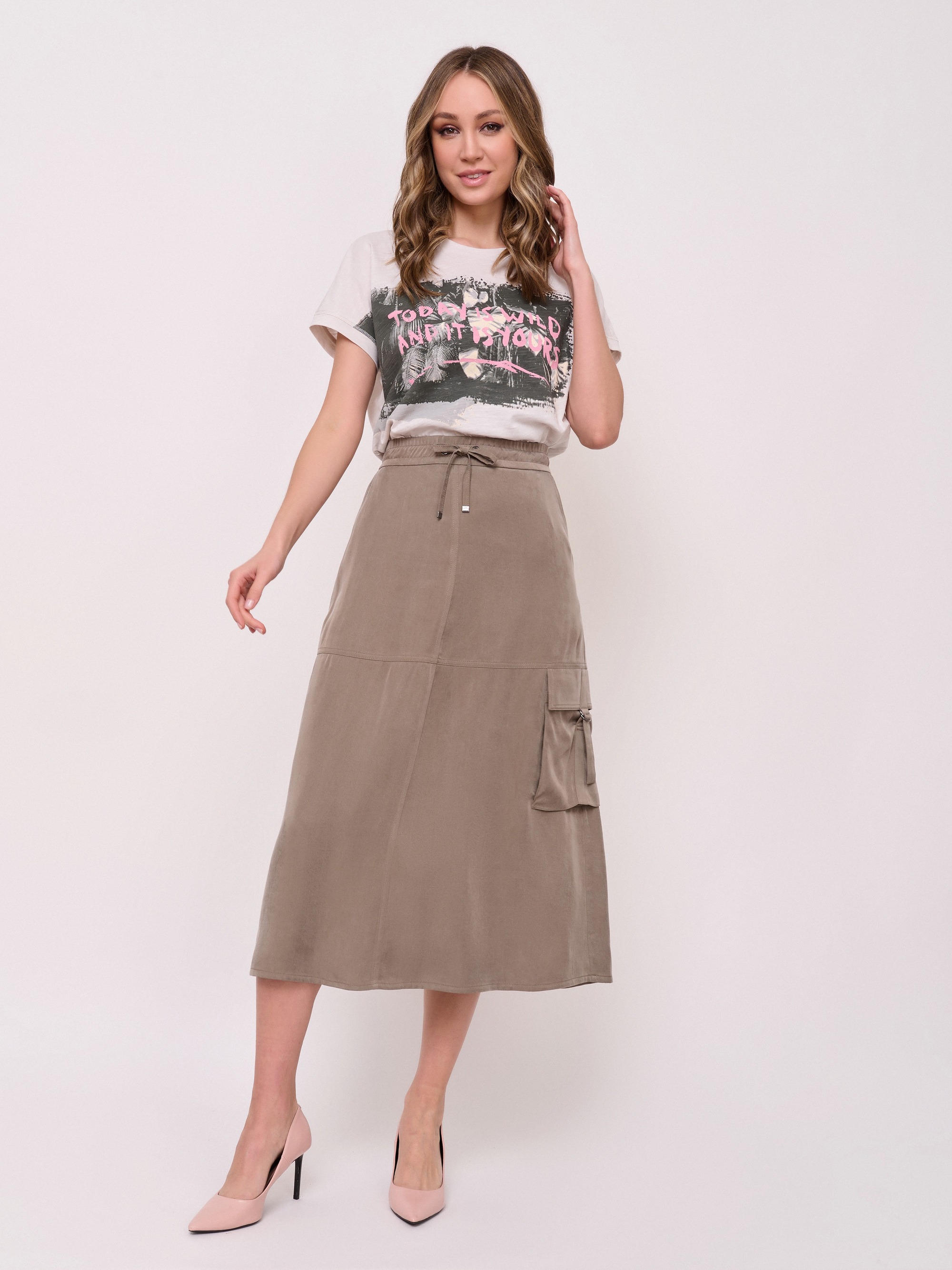 Детали: застежка молния, покрой расклешенный, посадка средняя, без рисунка, карманы косые, конструктивные элементы крой клиньями, модель юбки расклешенная, длина юбки миди. Длина по спинке: 81 см.