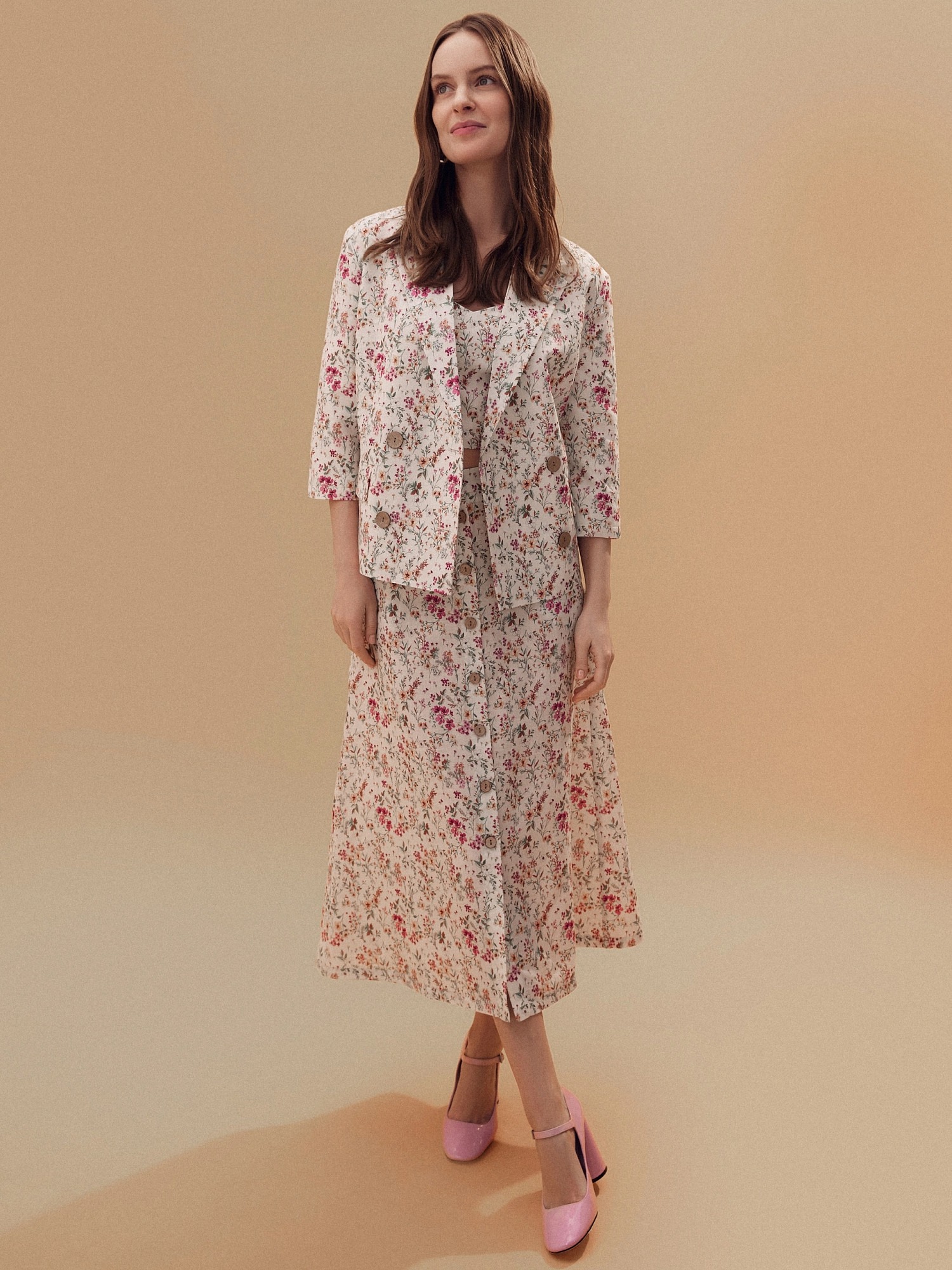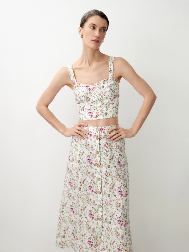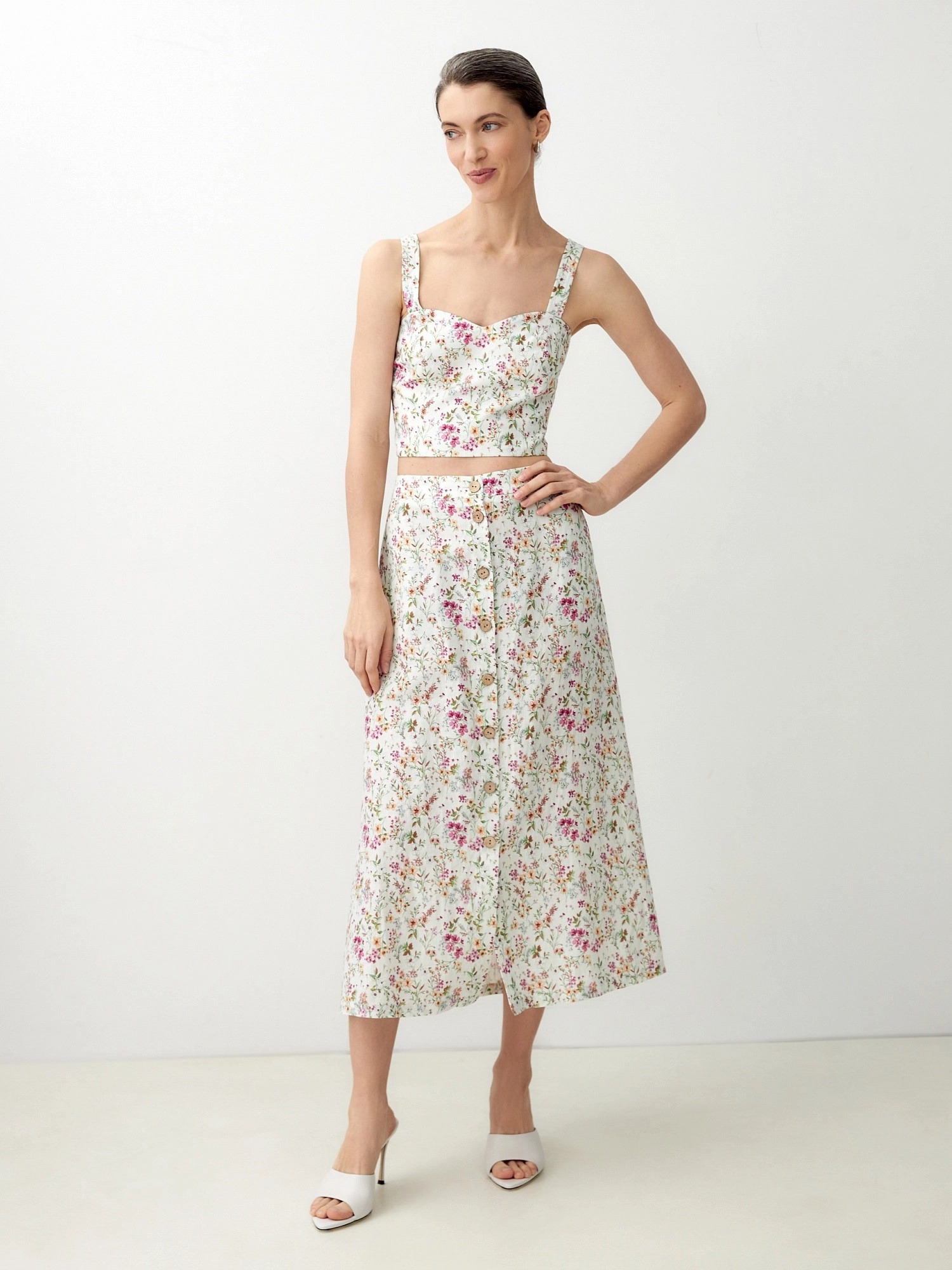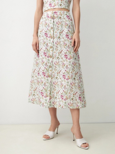 Романтичная миди юбка из принтованной льняной ткани с застежкой по переду на кокосовые пуговицы, на подкройном поясе. На спинке резинка. Юбка с двумя функциональными карманами по бокам. Соберите идеальный образ с жакетом (арт. 3100081MB0590)