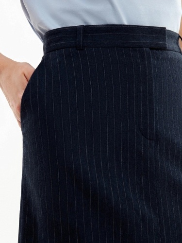 Прямая юбка длины миди, на талии с гульфиком по центру, на притачном поясе со шлевками. Разрез спереди по центру. Юбка из 100% хлопковой костюмной ткани в тонкую полоску. Рабочие карманы по бокам.