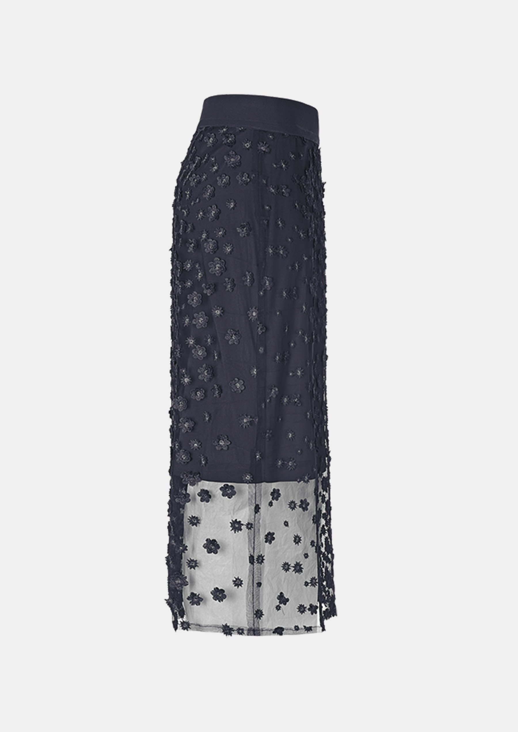 Юбка-миди с замысловатой объемной цветочной вышивкой, которая поднимет вам хорошее настроение. Юбка-комбинация прямого кроя изготовлена из тонкого черного тюля, который в сочетании с синими объемными цветами создает красивый глубокий синий цвет.