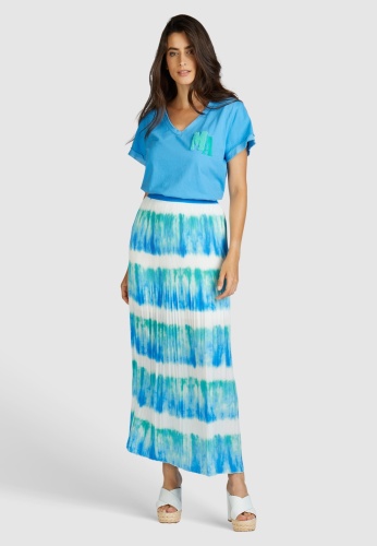 Атласная юбка с принтом батик из небрежно ниспадающего японского атласа имеет удобную эластичную манжету для настоящего комфорта. Вырез узкий сверху и небрежно широкий внизу. Юбка плиссирована сверху и благодаря вискозной подкладке полностью непрозрачна.