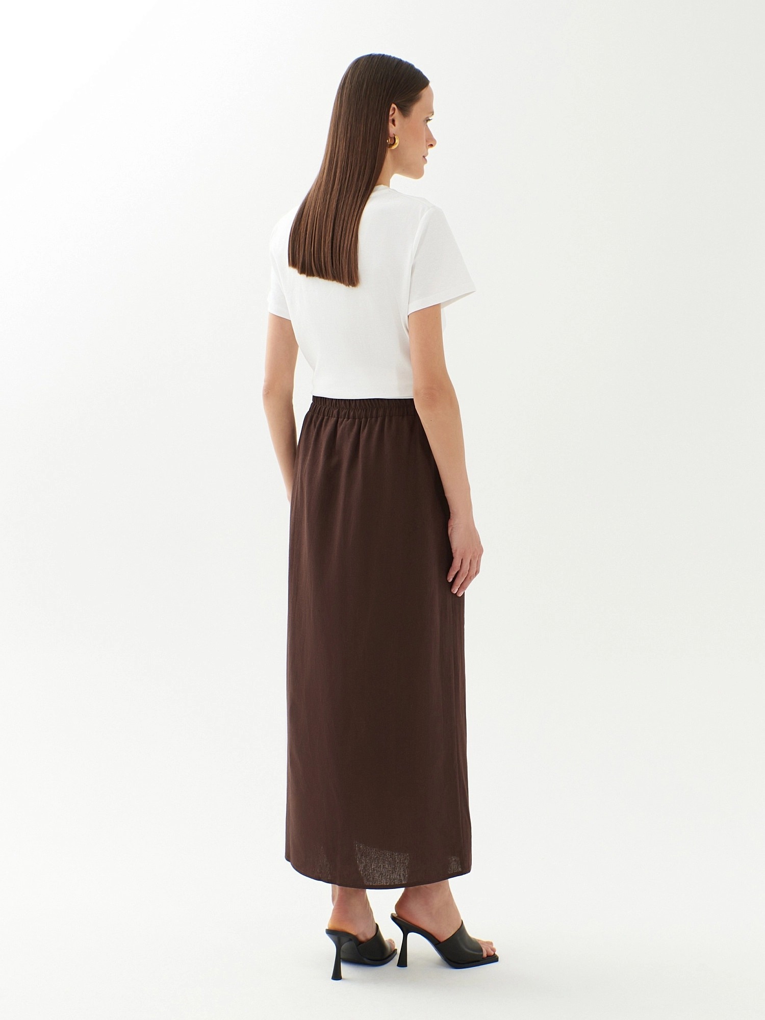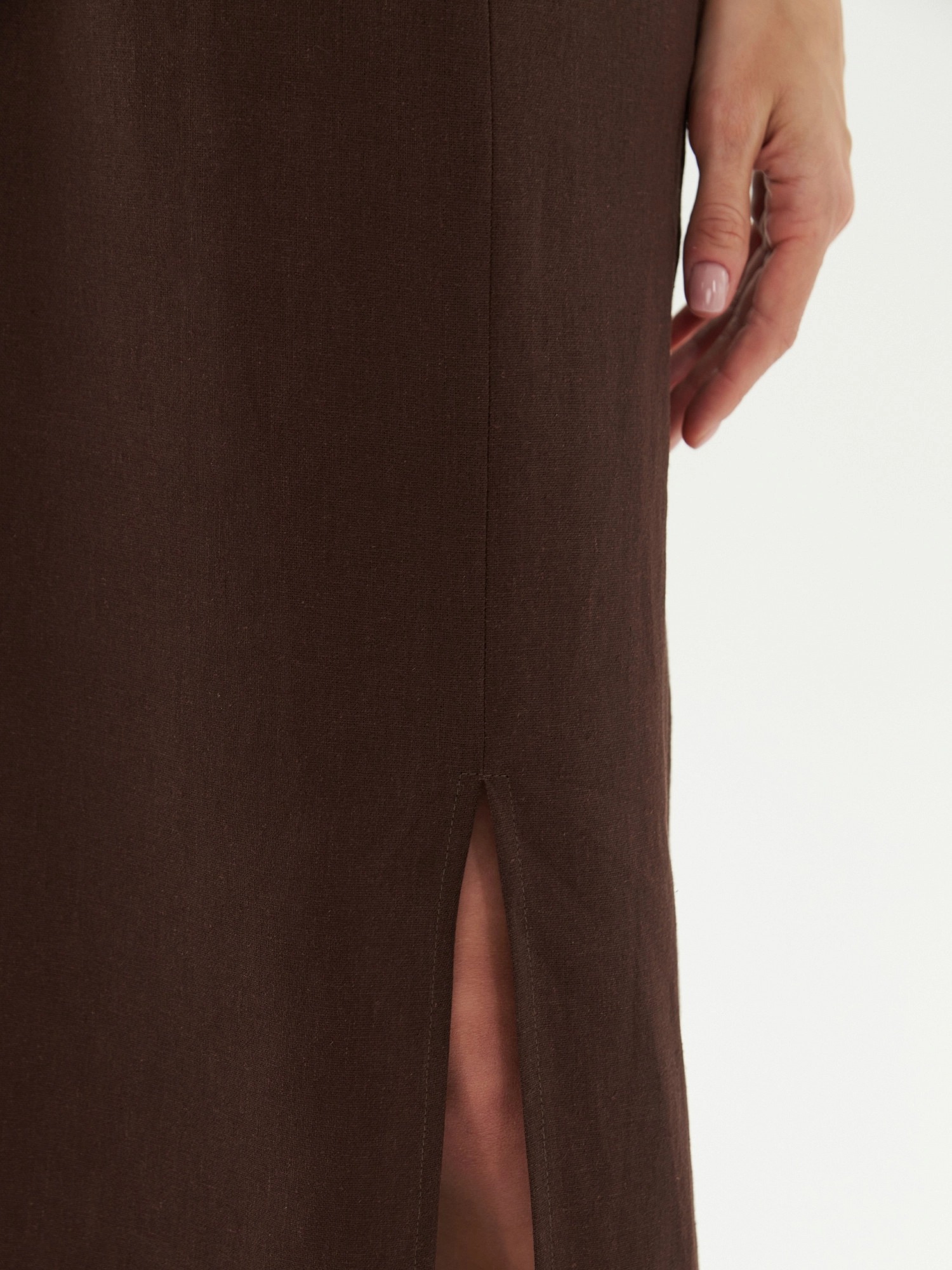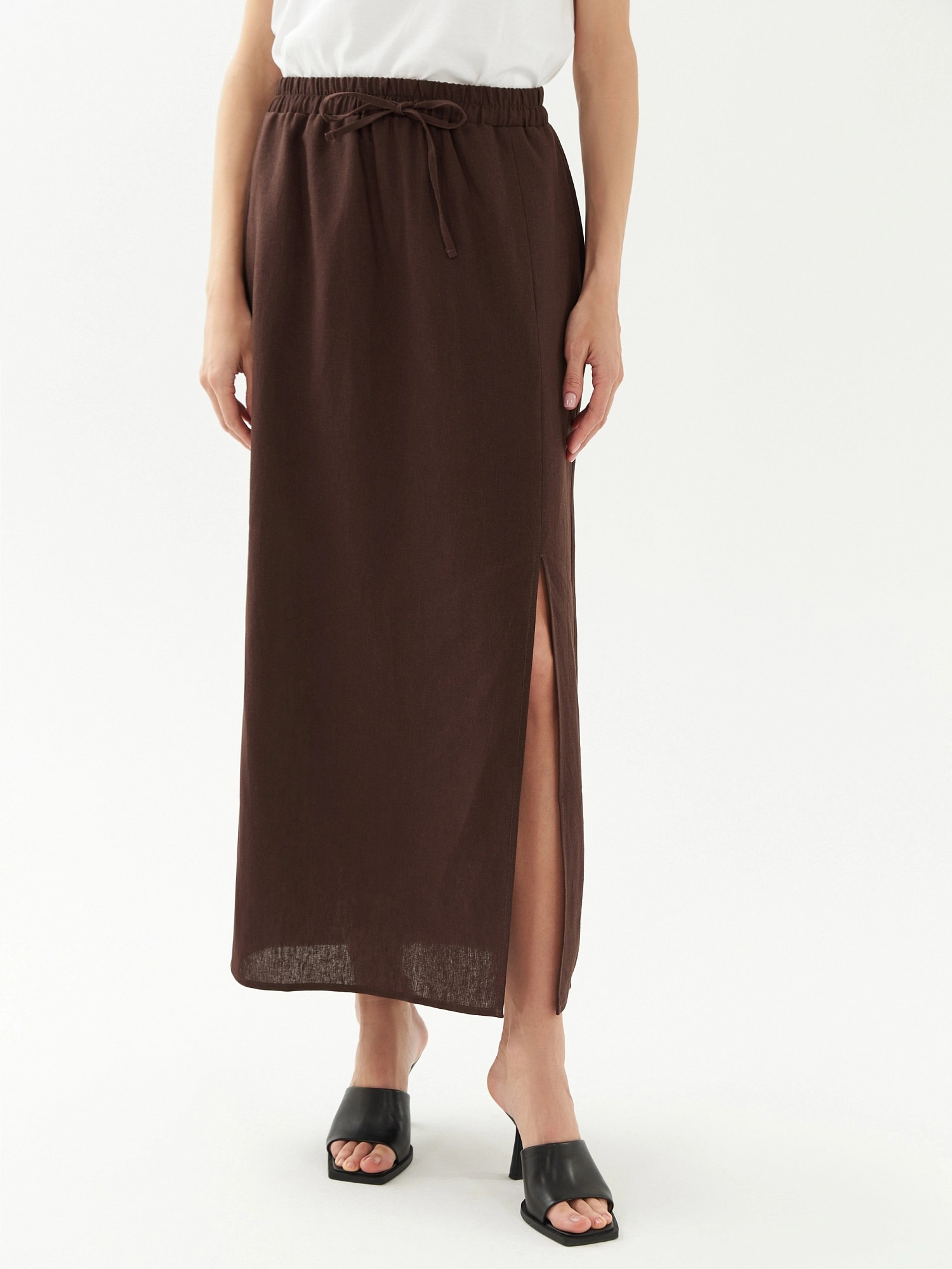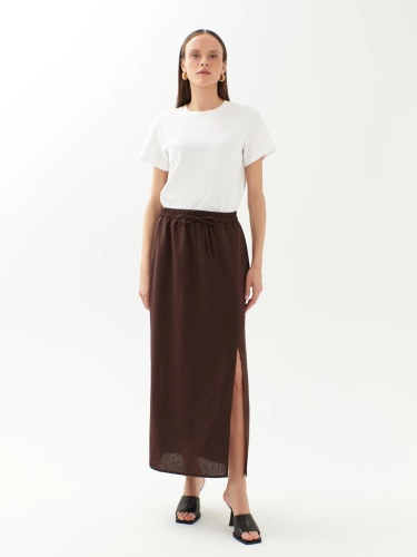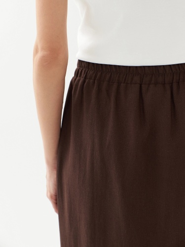 Юбка трапеция на резинке со шнурком из основной ткани для регулировки прилегания по талии. Юбка миди выполнена из льняной ткани в шоколадном цвете. По переду разрез.