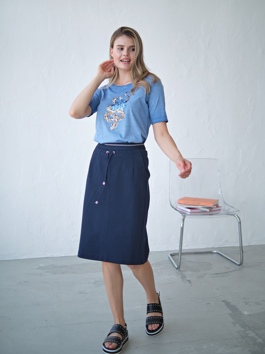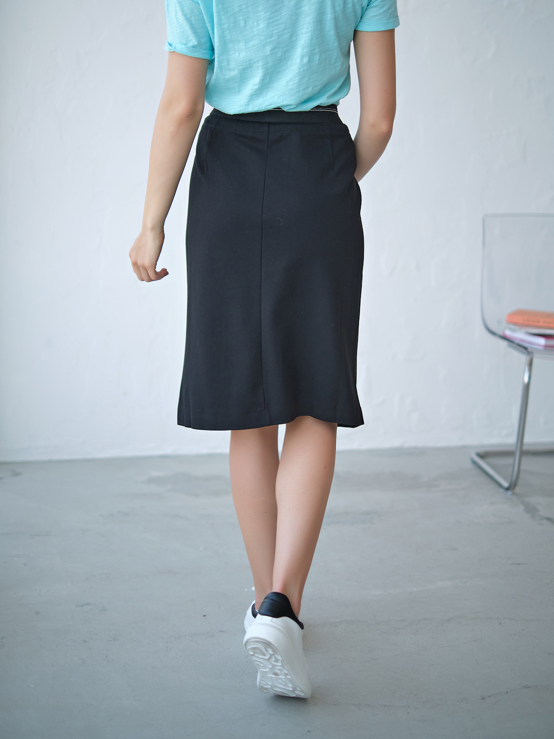 Юбка прямого кроя. Универсальная длина до колена. Прорезные карманы. Шнуровка на талии.