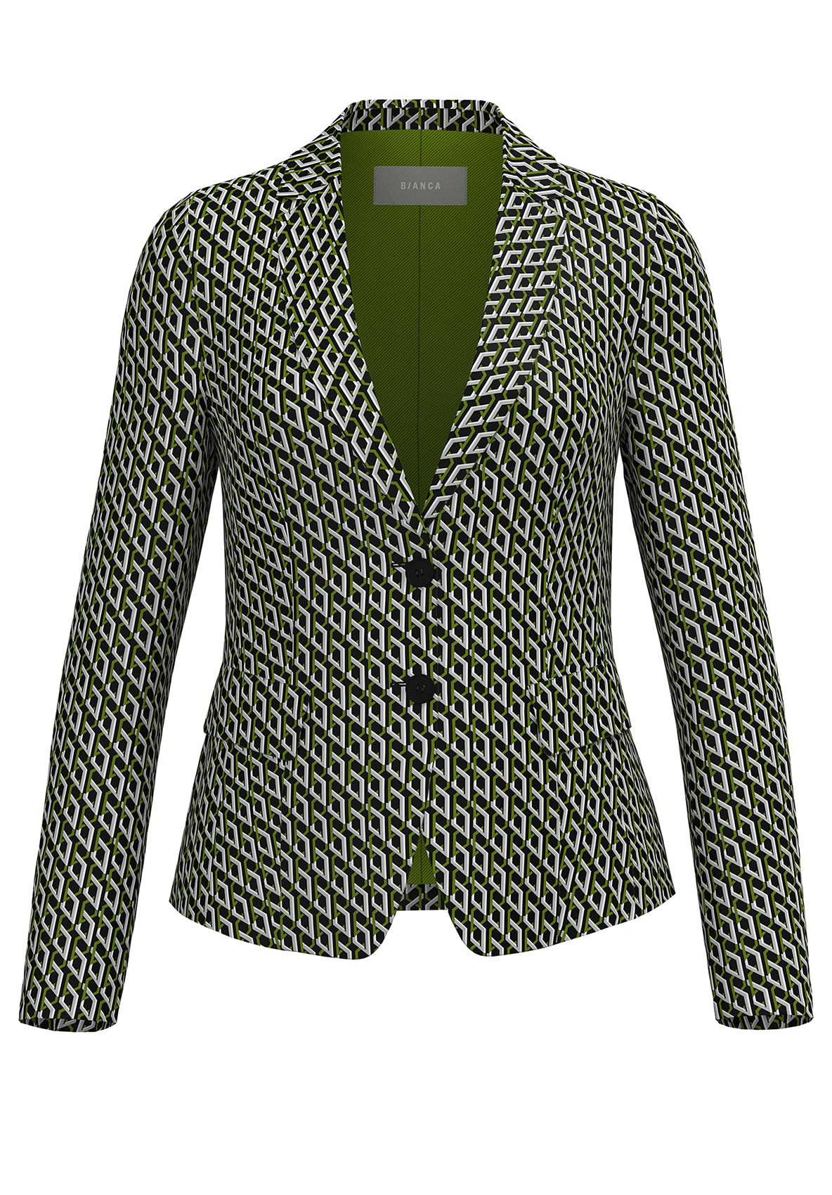 Слегка приталенный жакет с геометрическим принтом привлекает внимание. Черно-белый цвет с серо-зелеными акцентами подчеркивает любой наряд. Завершают образ такие модные акценты, как карманы с клапанами, застежка на пуговицы и стильный воротник с лацканами.