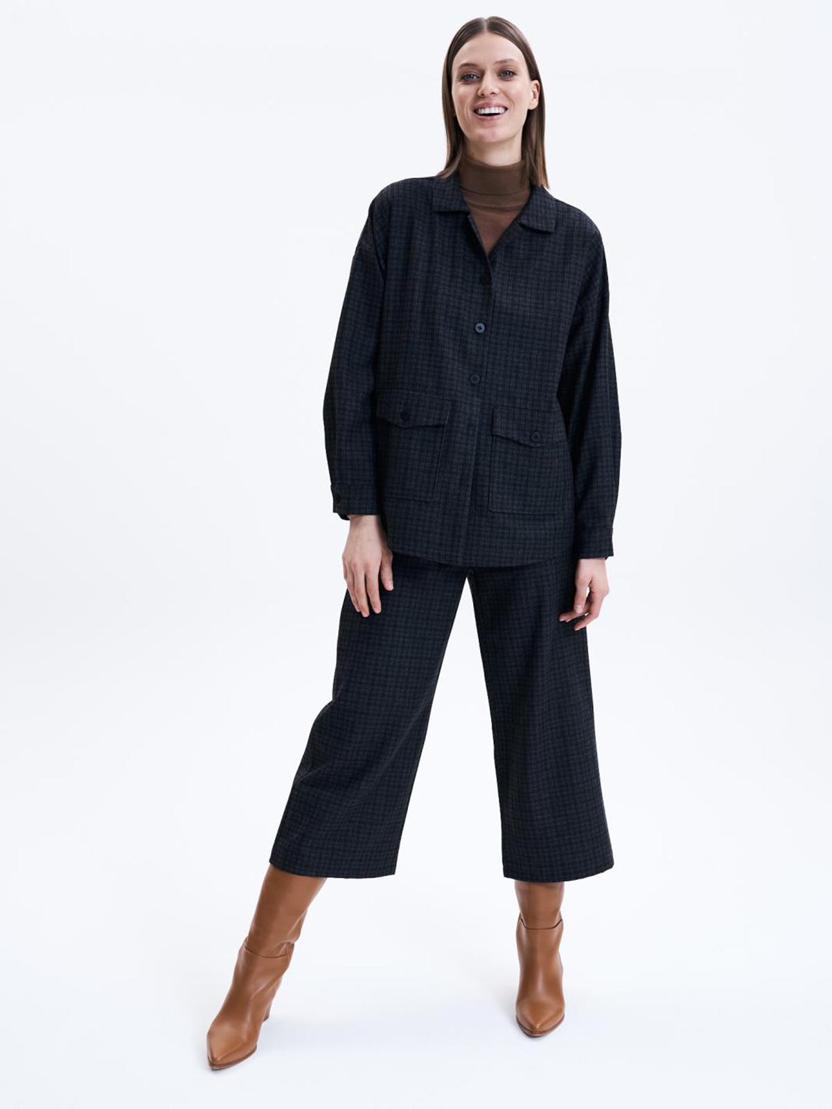 Жакет свободного кроя на пуговицах. Отложной воротник, накладные карманы с клапанами, втачной рукав полной длины.