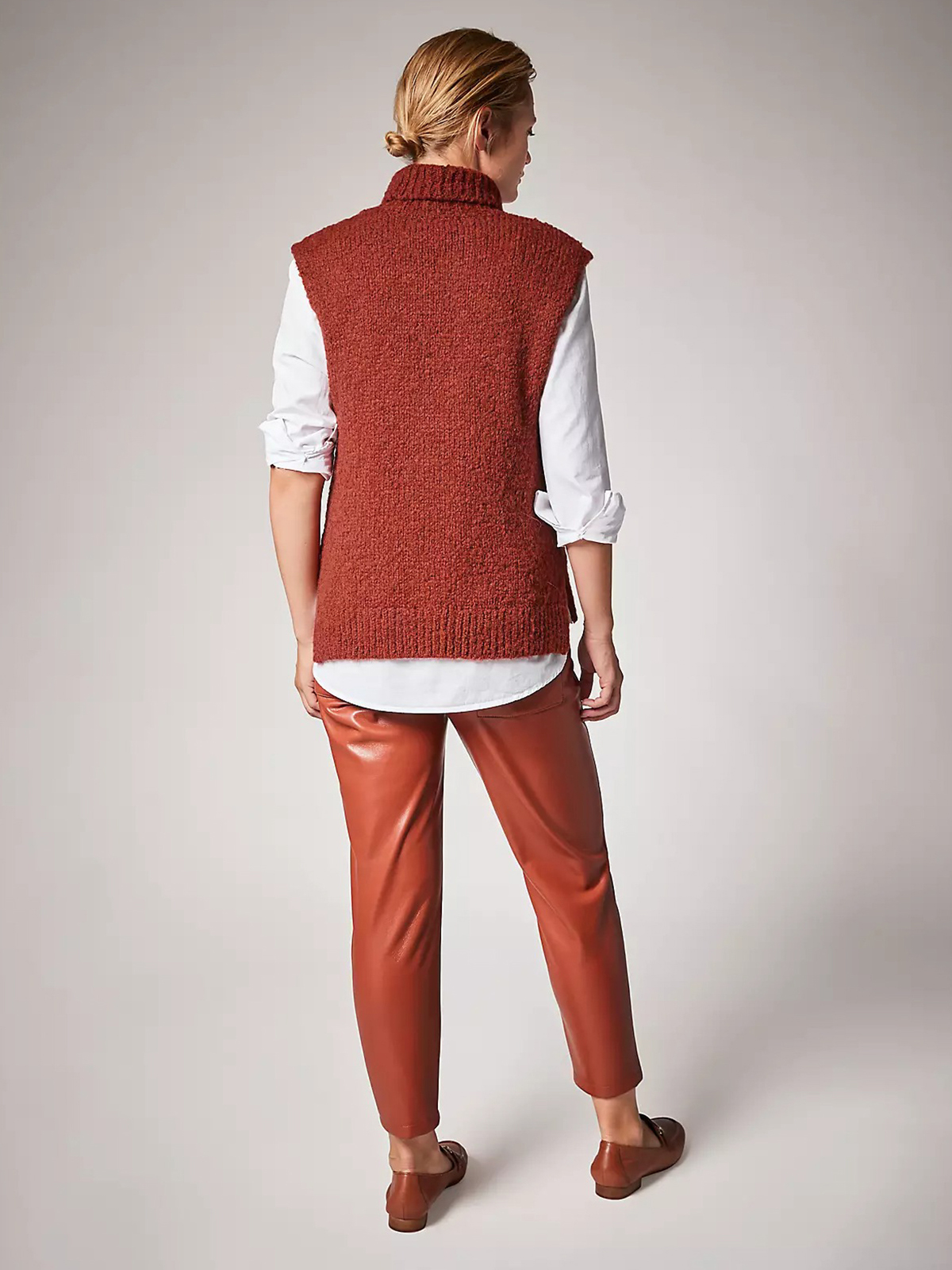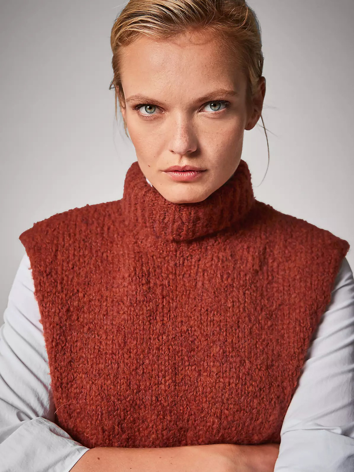 Однотонный вязаный жилет прямого кроя с добавлением шерсти альпаки в составе хорошо сохраняет тепло и приятен на ощупь. Предпочтительнее носить жилет поверх рубашки, джемпера или водолазки. Высокий воротник-стойка, по низу вязаная резинка в рубчик.