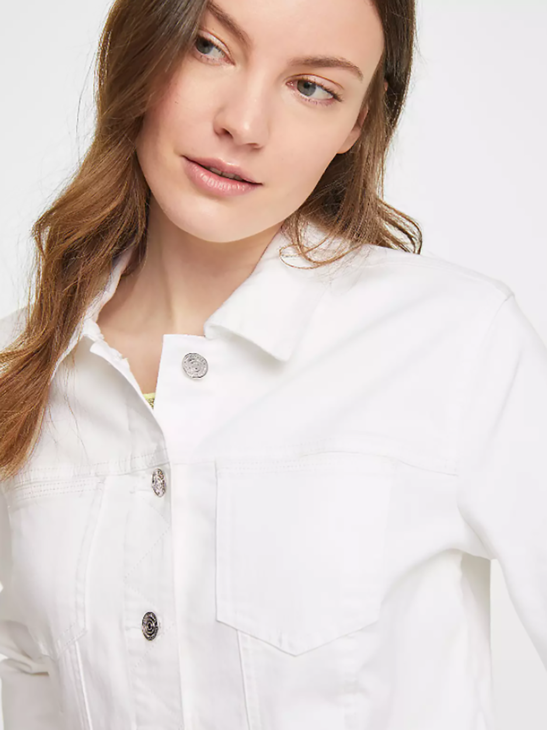 Однотонная джинсовка цвета хаки – универсальная вещь для повседневного городского образа. Отложной рубашечный воротник, накладные карманы с клапаном на груди. Втачной рукав полной длины.