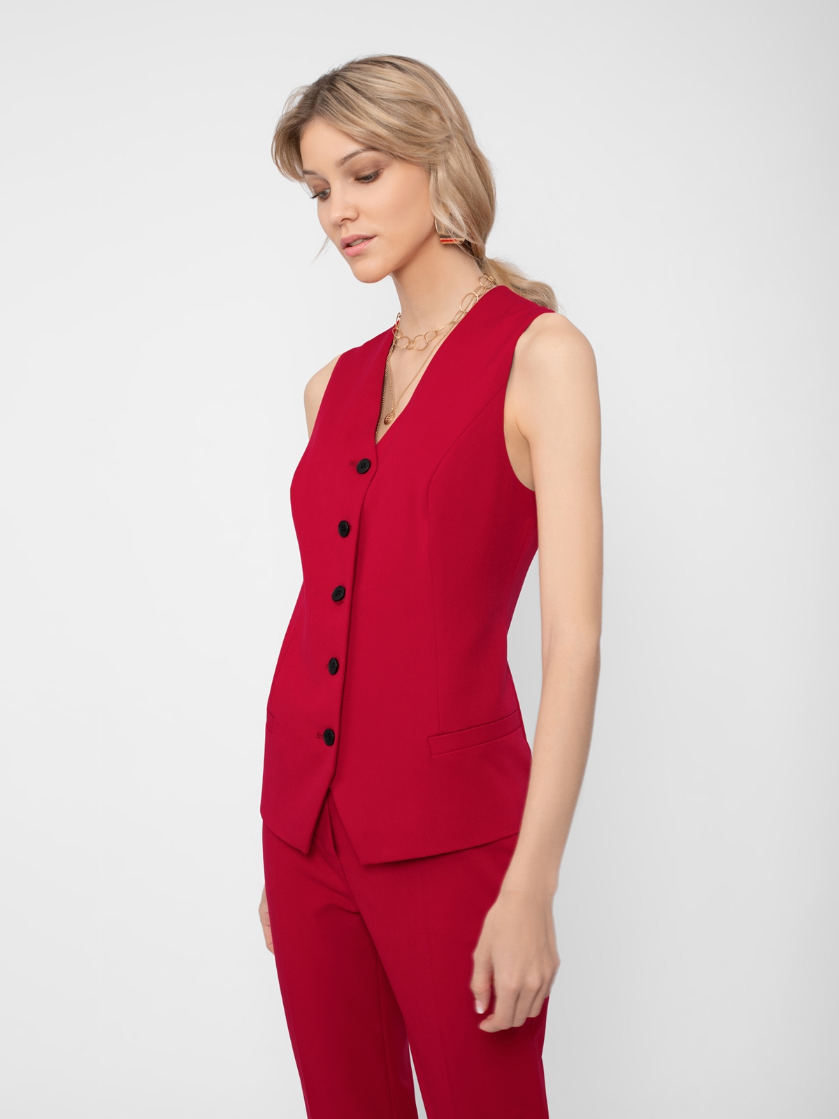 Жилет на подкладке полуприлегающего силуэта с v-образным вырезом горловины и прорезными карманами-листочками. Застежка спереди на пуговицы.