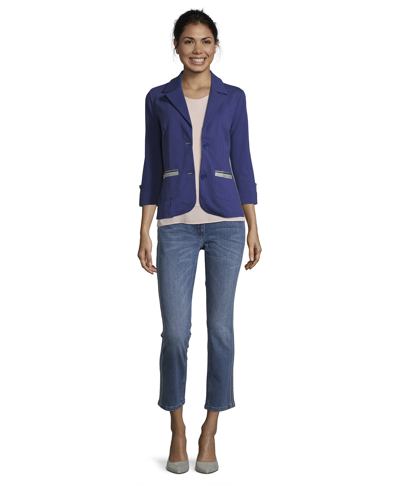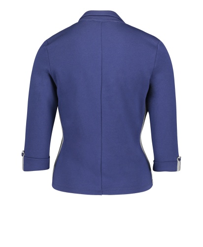 Классический жакет - абсолютно необходимый элемент женского гардероба! Слегка приталенный крой подчеркивает достоинства фигуры. Отложной воротник, застежка на пуговицах, рукава 3/4 с патой для подворачивания, карманы с отделкой. Блестящая тесьма придает образу нотку гламура. Материал из хлопковой смеси приятен к телу и обеспечивает комфорт. Этот жакет будет изюминкой как делового, так и кэжуал образа.