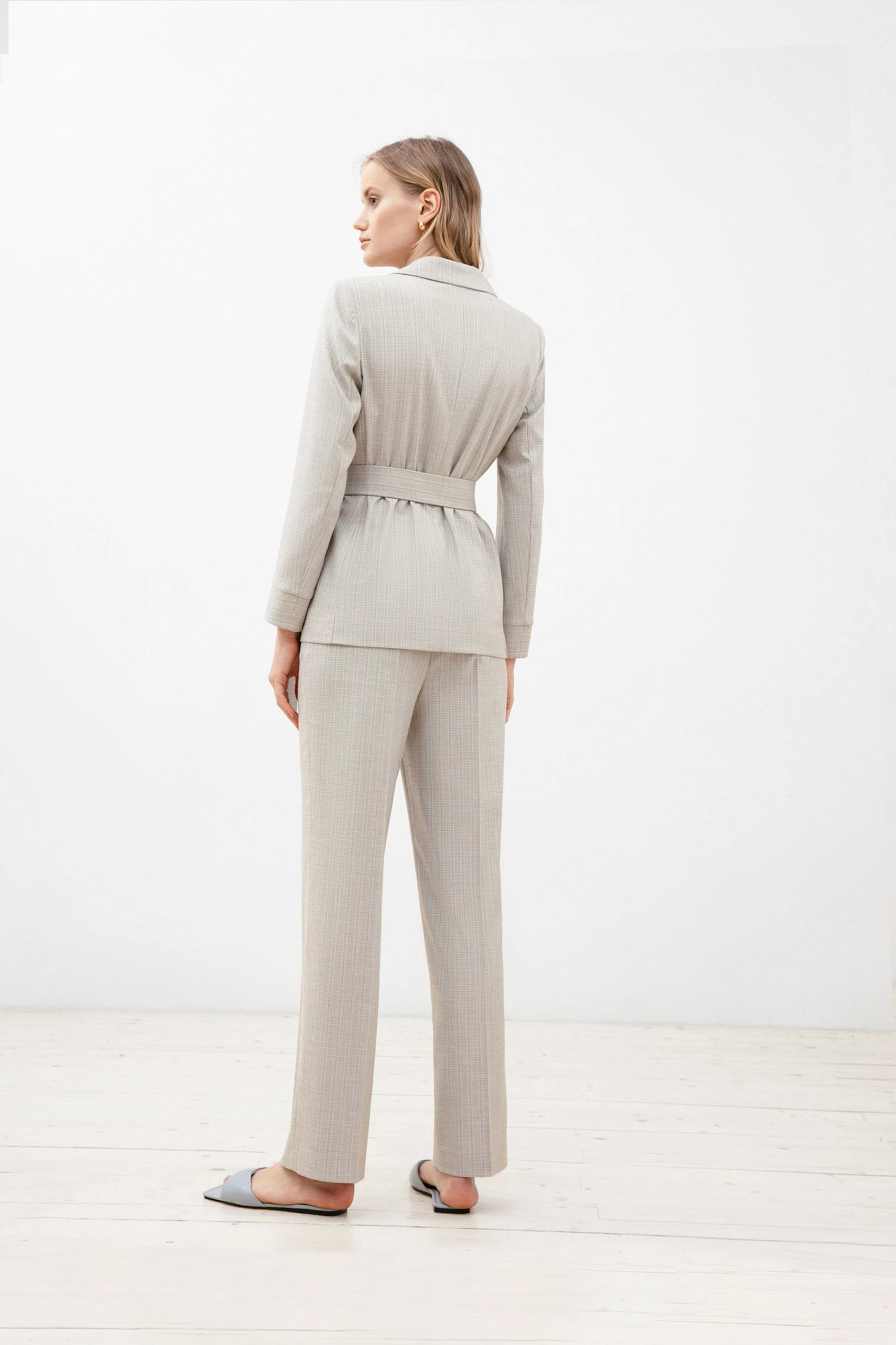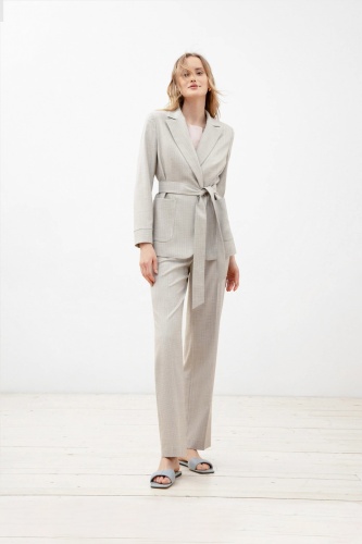 Российский бренд. На сайте указаны Российские размеры. Жакет из мягкой костюмной ткани с вискозой в составе полуприлегающего силуэта с английским воротником, втачным рукавом и крупными накладными карманами. Застежка спереди на пуговицу. В комплекте съемный пояс из ткани для создания более приталенного силуэта. Модель идеально сочетается с брюками POMPA (арт. 3118483rm0190)