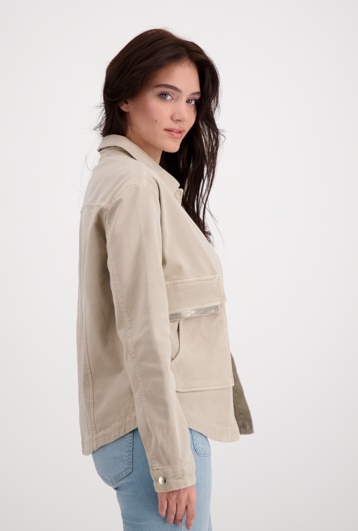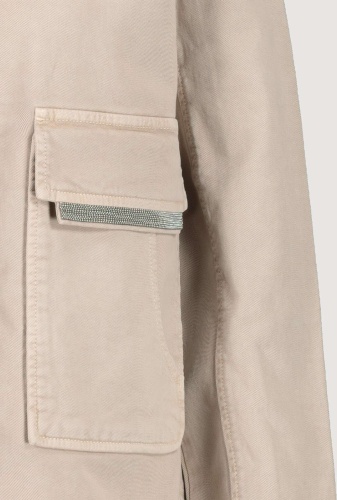 На сайте указаны Российские размеры. Куртка с отложным воротником и накладными карманами. Модель с длинными рукавами и потайной планкой на кнопках отличается большими карманами с клапанами на цепочке и дополнительными прорезными карманами спереди. Форма: прямой крой с закругленным низом, отложной воротник, рукава заканчиваются разрезом и манжетами на одной пуговице. Швы: передний плечевой, продольные разделительные швы на рукавах и спинке, кокеточный шов на спинке. Параметры модели: 42 размер, рост 176 см