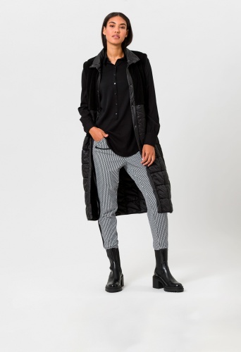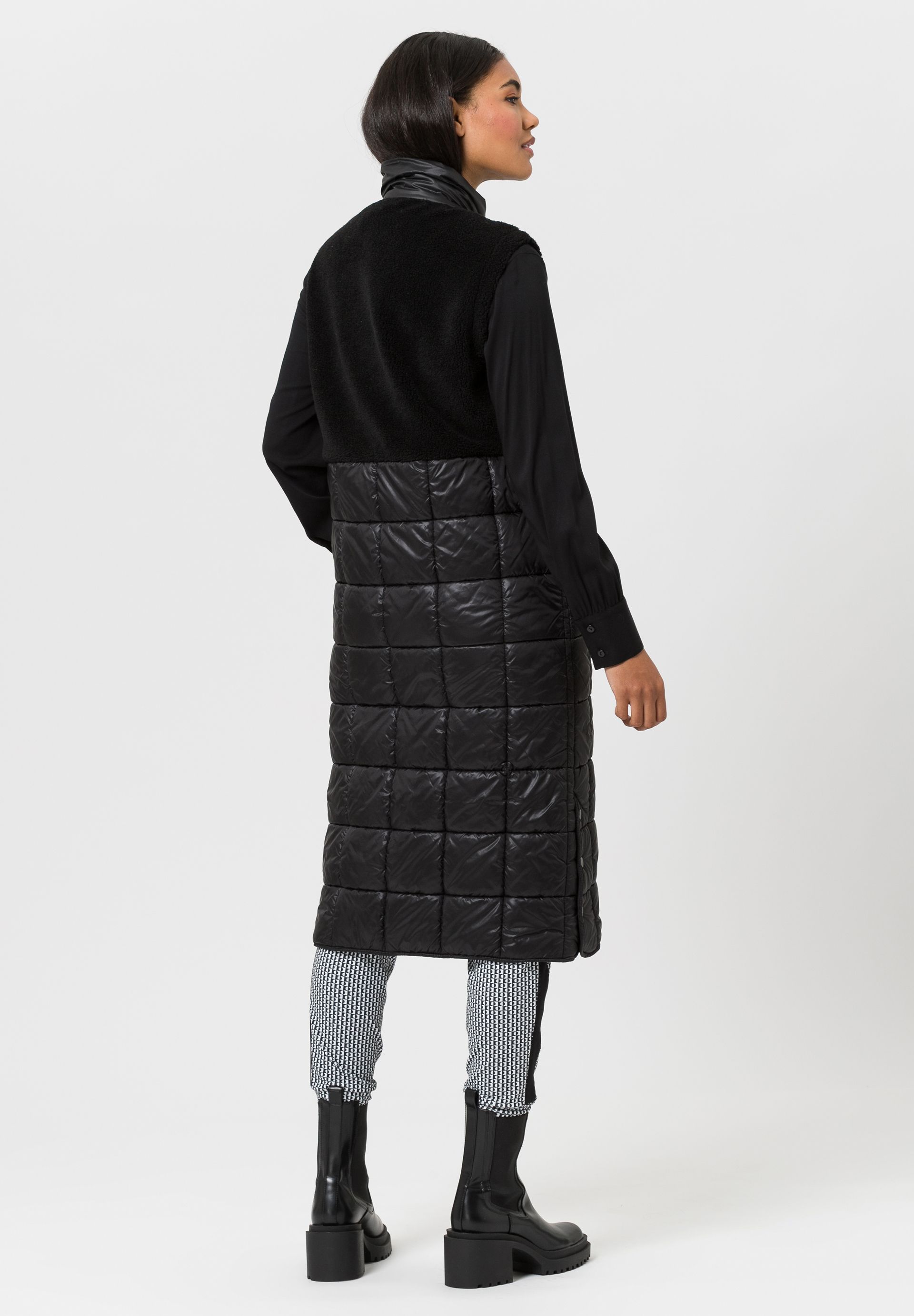 На сайте указаны российские размеры. Жилет с отделкой из искусственного меха в области плеч и груди, которые переходят в квадратный стеганый рисунок на уровне талии. Сквозная панель с кнопками легко открывается и закрывается. Высокий воротник, пуговицы по низу и боковые карманы делают образ идеальным.