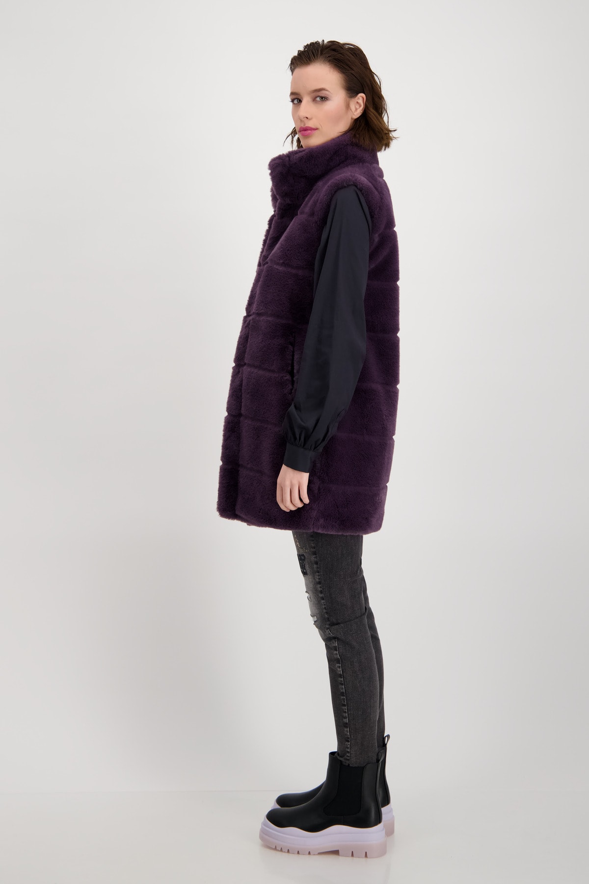 На сайте указаны российские размеры. Длинный жилет из искусственного меха с воротником-стойкой. С приятным мягким жилетом из меха от monari вы сможете создать стильный образ в кратчайшие сроки. Длинная модель прямого кроя с воротником-стойкой, планкой на потайных кнопках и боковыми карманами идеально подходит для создания повседневных образов с платьями и брюками. Модель ростом 179 см.
