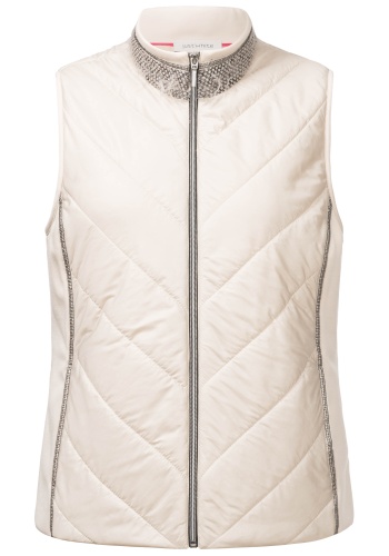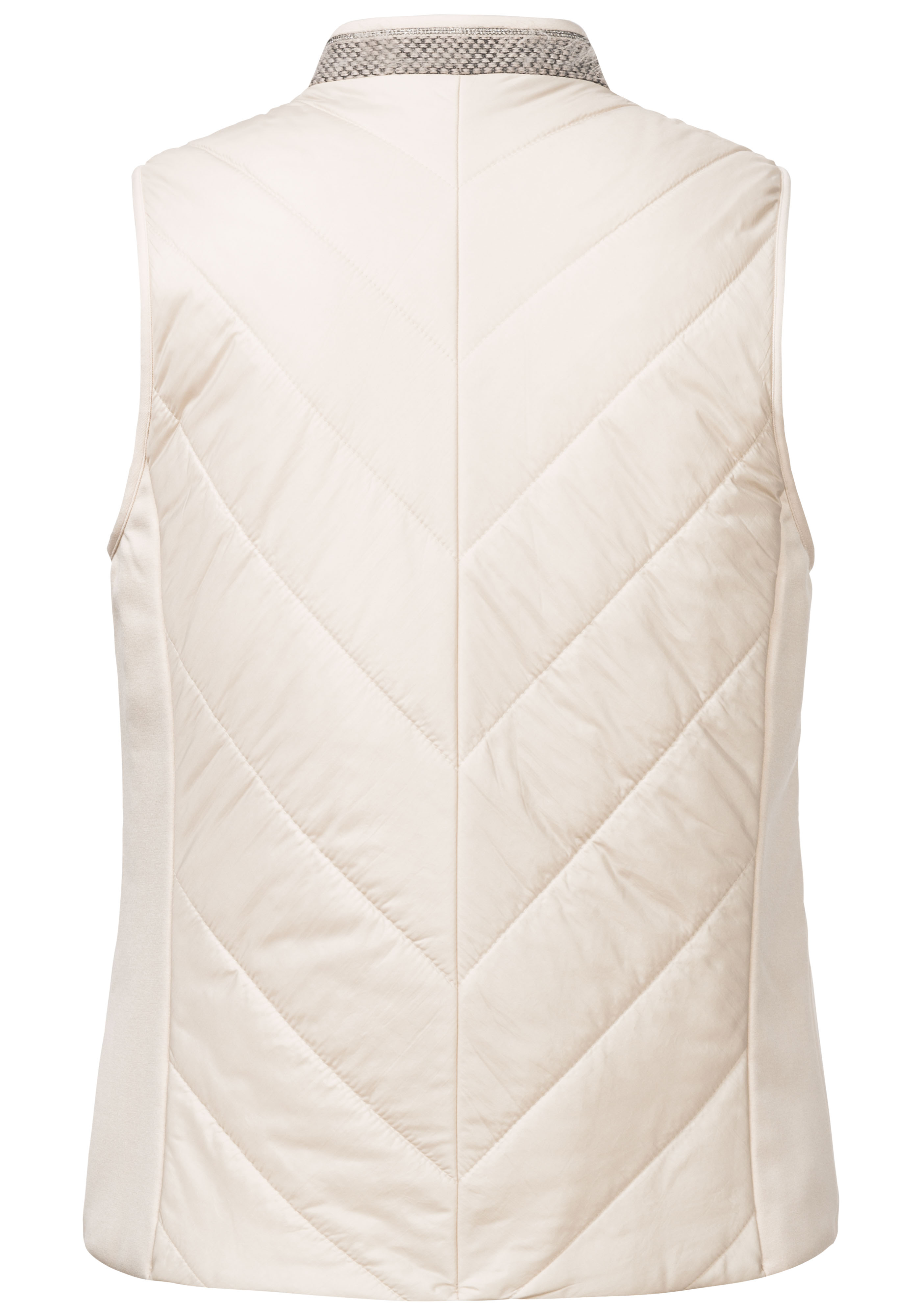 На сайте указаны российские размеры. Стеганая безрукавка из эксклюзивного сочетания материалов с элегантной трикотажной вставкой. Изюминкой стеганого жилета являются модный вязаный воротник и блестящие контрастные швы. Двусторонняя молния и высокий застегивающийся воротник особенно практичны и подчеркивают приятный комфорт при ношении. Наша модель ростом 177 см. Измерения для 44 размера: Окружность груди: 102 см Талия: 95,1 см Бедра: 42 дюйма Длина спинки: 60 см.