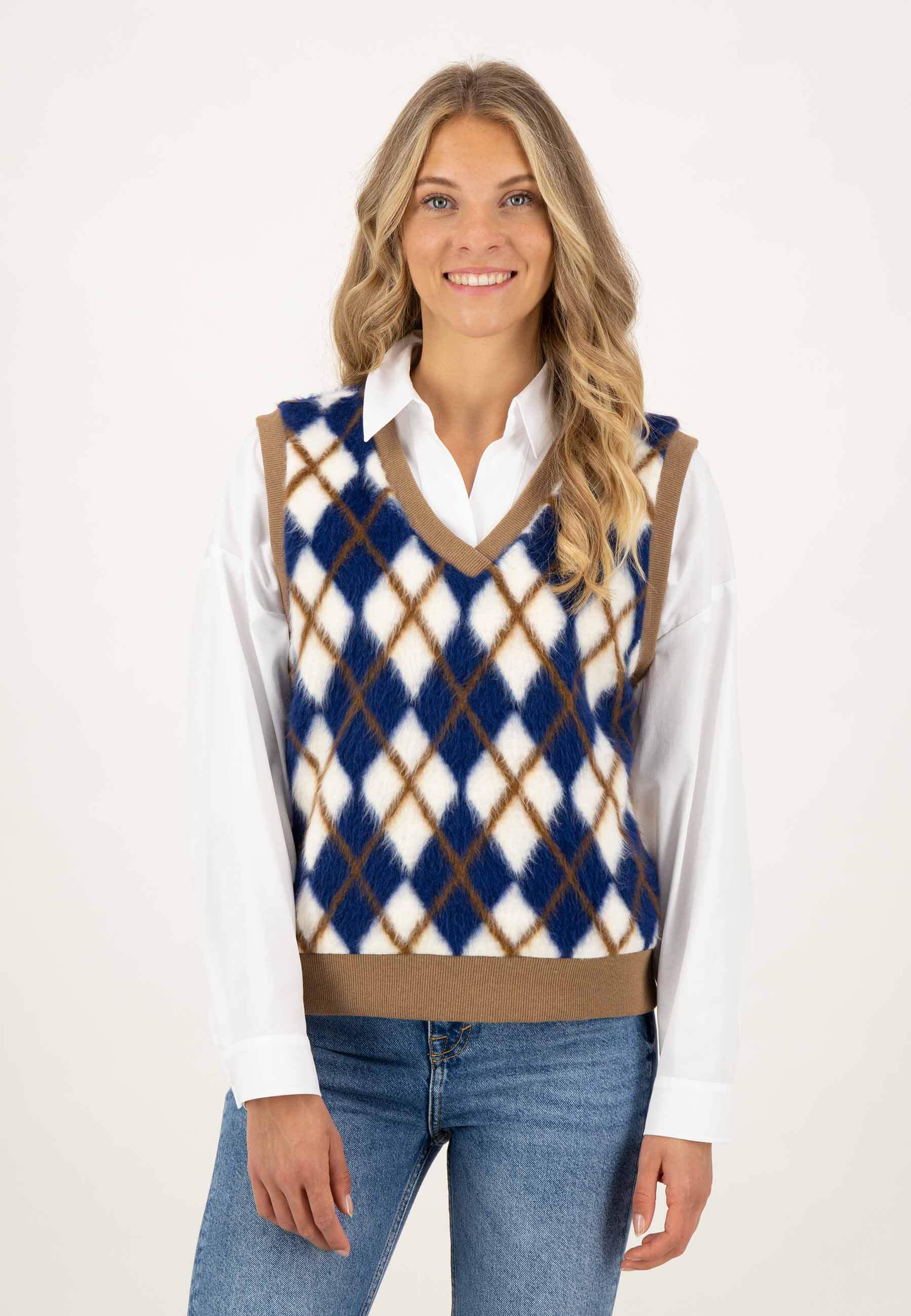 На сайте указаны российские размеры. Свитер-жилет с ромбовидным узором синего цвета. Благодаря своему красивому рисунку, широкому низу и V-образному вырезу этот комбинезон не только визуально привлекает внимание, но и сохраняет тепло и уют. Наша модель ростом 177 см. Измерения для 44 размера: Окружность груди: 99 см Талия: 100 см Бедра: 96 см Длина по спинке: 59 см.