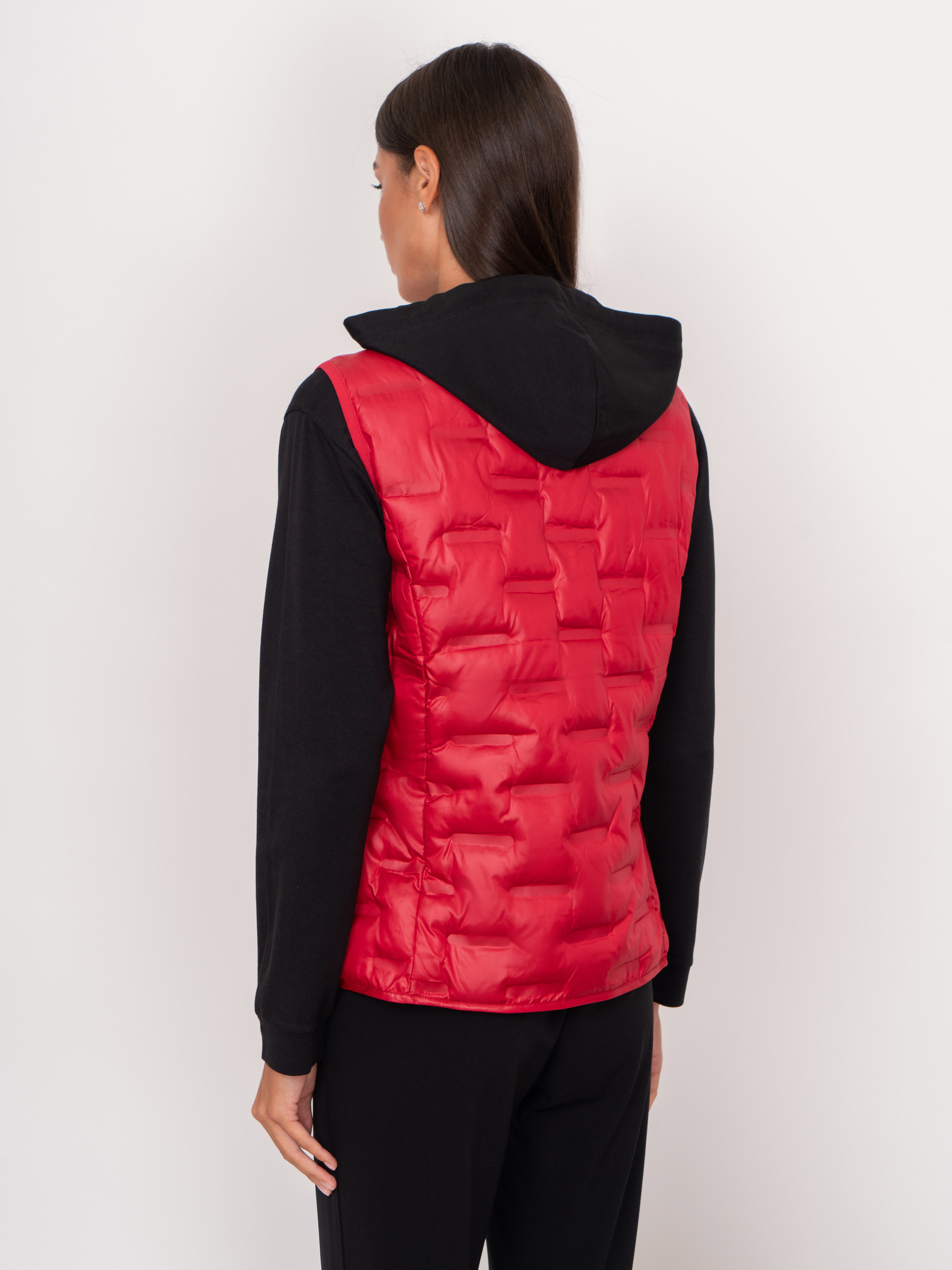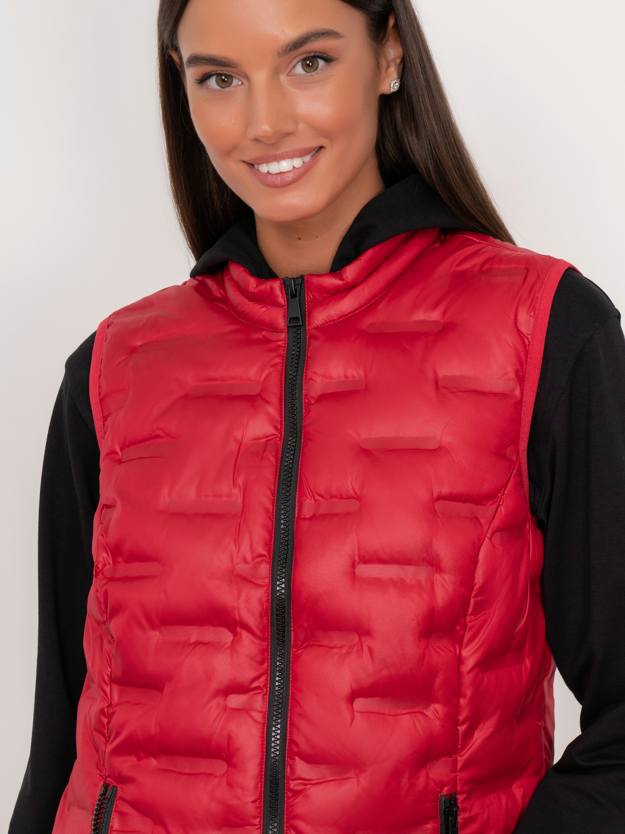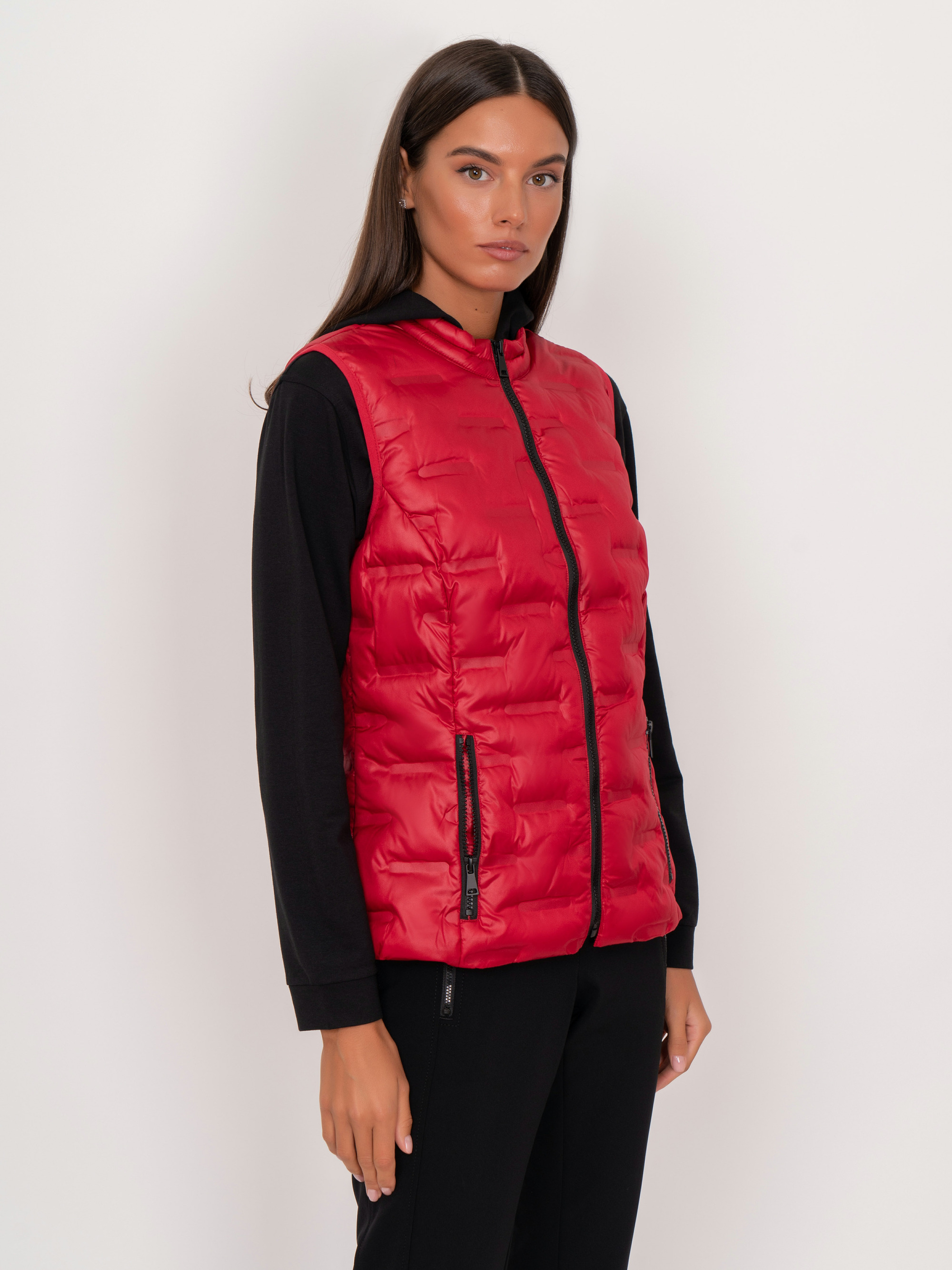 На сайте указаны российские размеры. Утепленный полуприталенный красный жилет на молнии, с воротником-стойка, с прорезными карманами. Рост модели: 175 см. Длина жилета: 62 см.