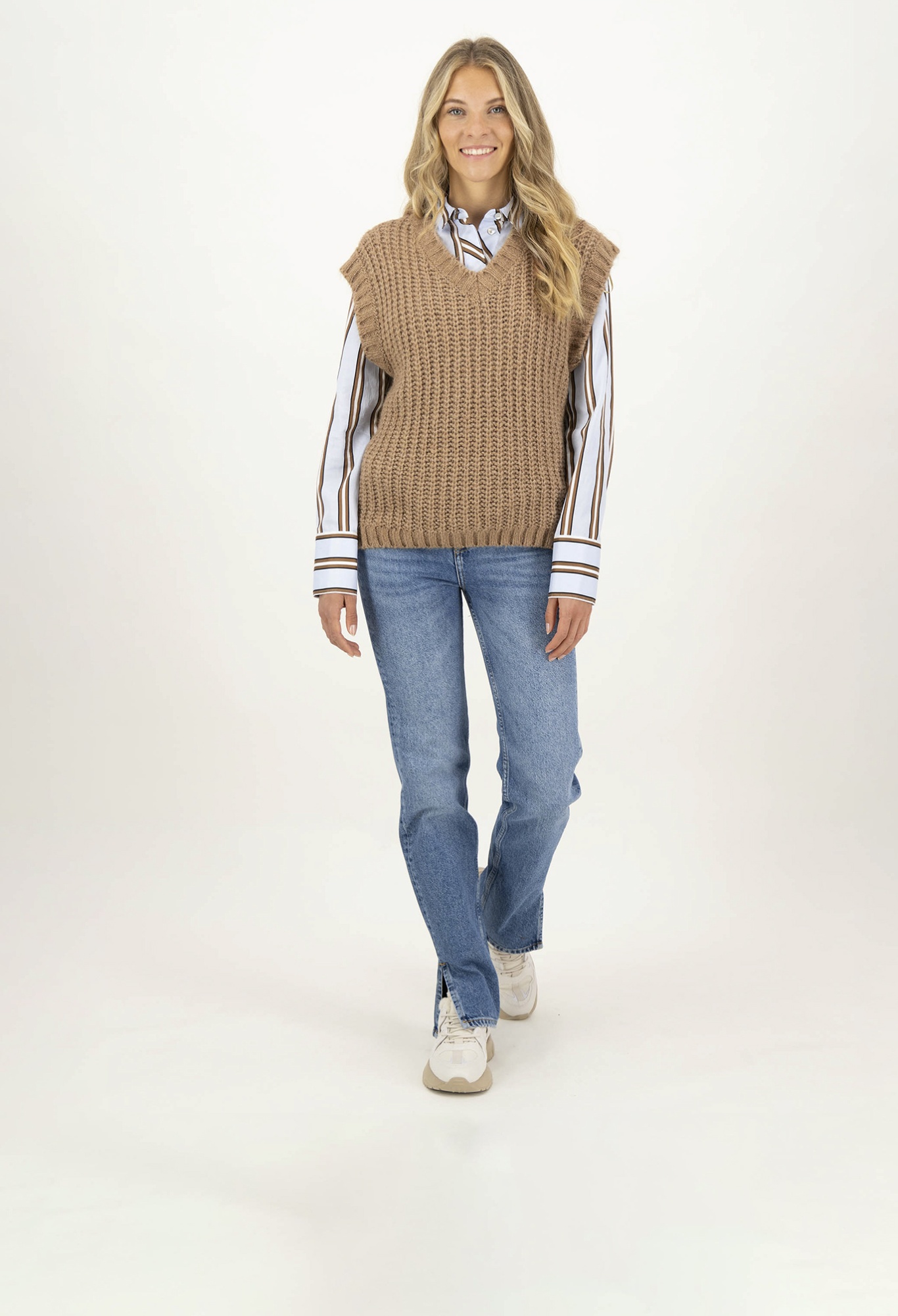 На сайте указаны российские размеры. Приятный мягкий свитер-жилет. С этой моделью из высококачественных материалов вы сможете создавать крутые образы в холодные дни. Благодаря V-образному вырезу слиповер идеально сочетается с блузой с отложным воротником или воротником-стойкой или со свитером с высоким воротником. Свободный крой в сочетании с ребристым вязанием и контрастным вязанием на рукавах, V-образном вырезе и по низу придают комбинезону спортивный и повседневный вид. Рост модели: 177 см. Измерения для 44 размера: Окружность груди: 57 см Бедра: 37 см Длина по спинке: 53 см Пройма: 25см