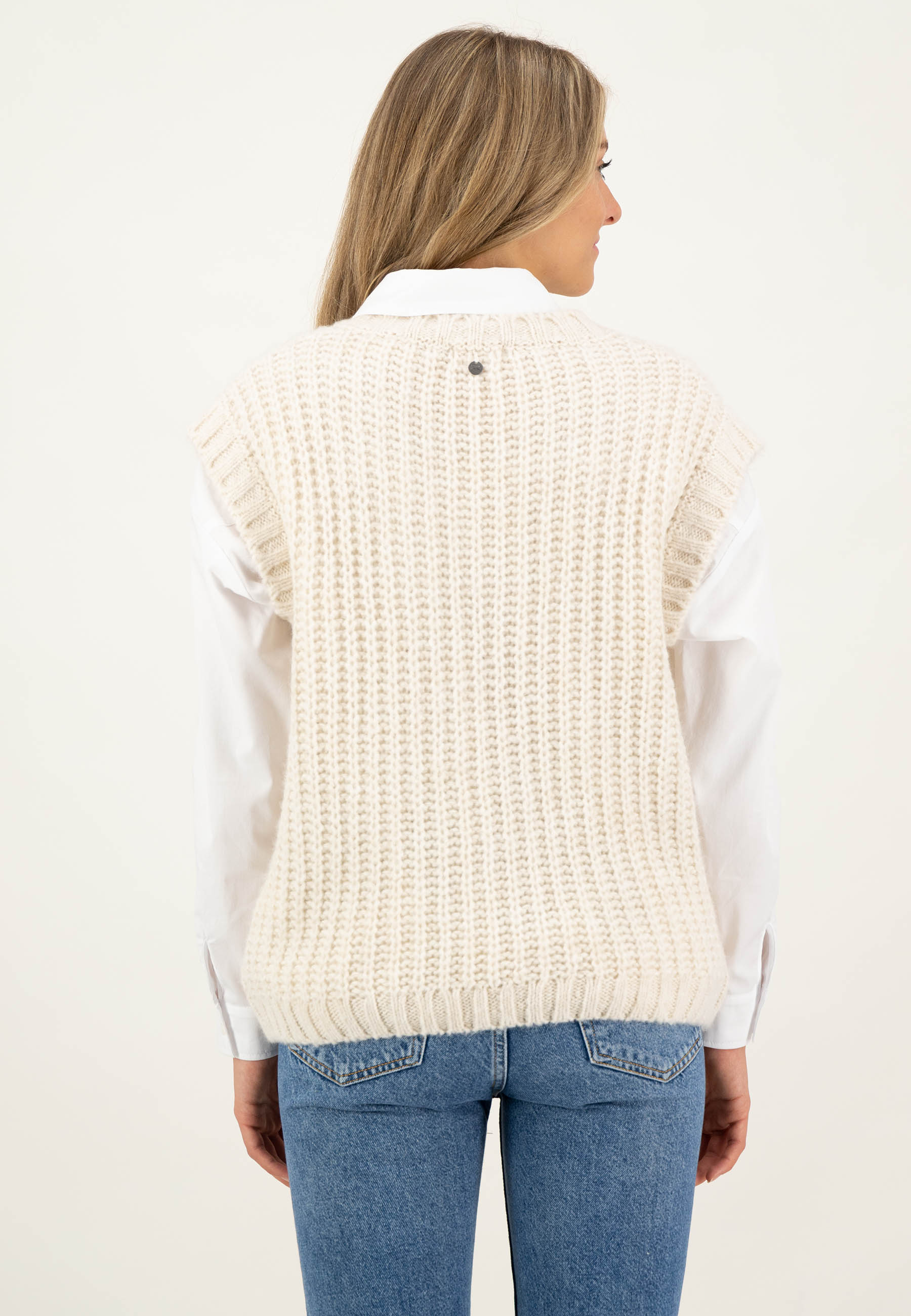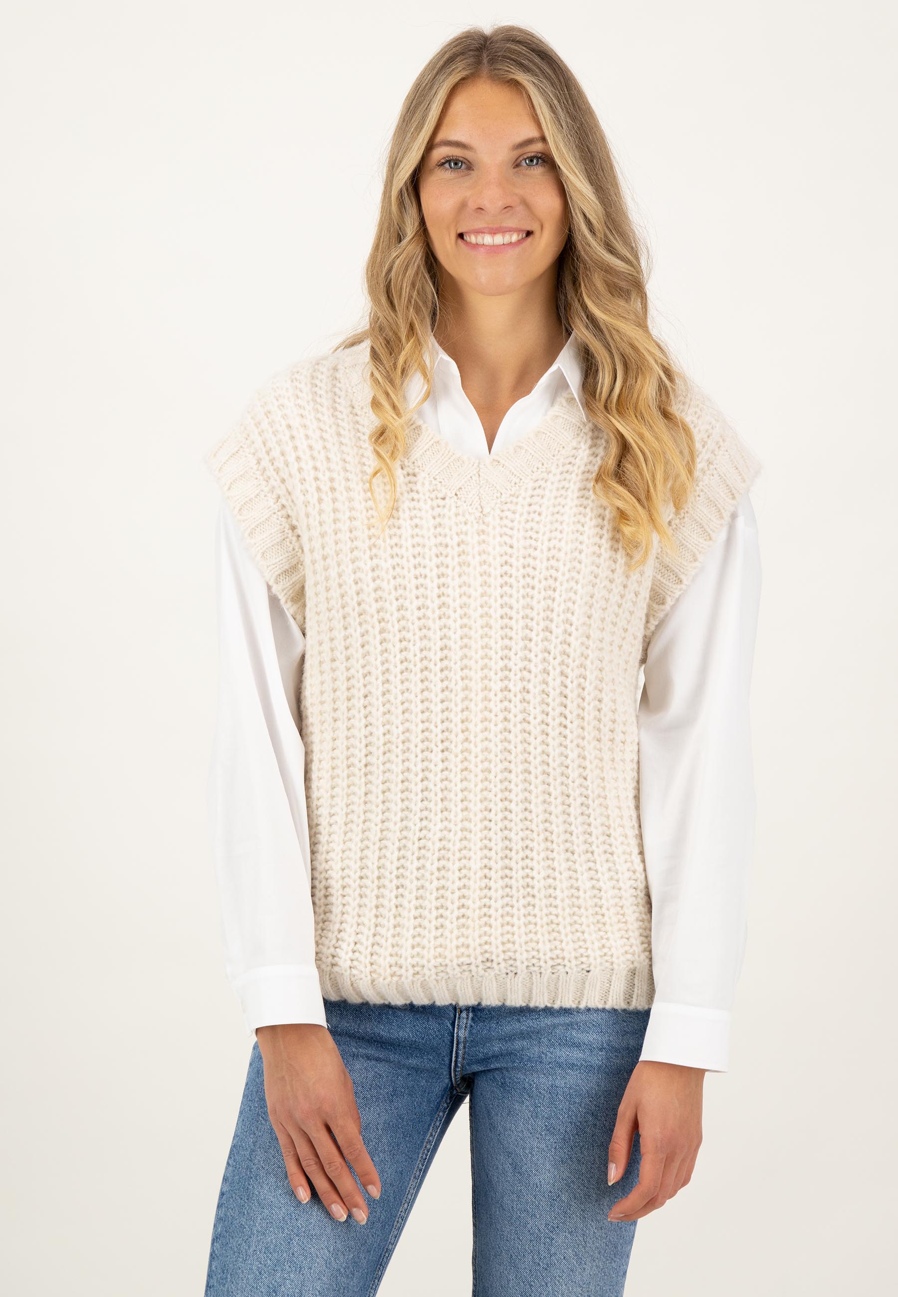 На сайте указаны российские размеры. Приятный мягкий свитер-жилет. С этой моделью из высококачественных материалов вы сможете создавать крутые образы в холодные дни. Благодаря V-образному вырезу слиповер идеально сочетается с блузой с отложным воротником или воротником-стойкой или со свитером с высоким воротником. Свободный крой в сочетании с ребристым вязанием и контрастным вязанием на рукавах, V-образном вырезе и по низу придают комбинезону спортивный и повседневный вид. Рост модели: 177 см. Измерения для 44 размера: Окружность груди: 57 см Бедра: 37 см Длина по спинке: 53 см Пройма: 25см