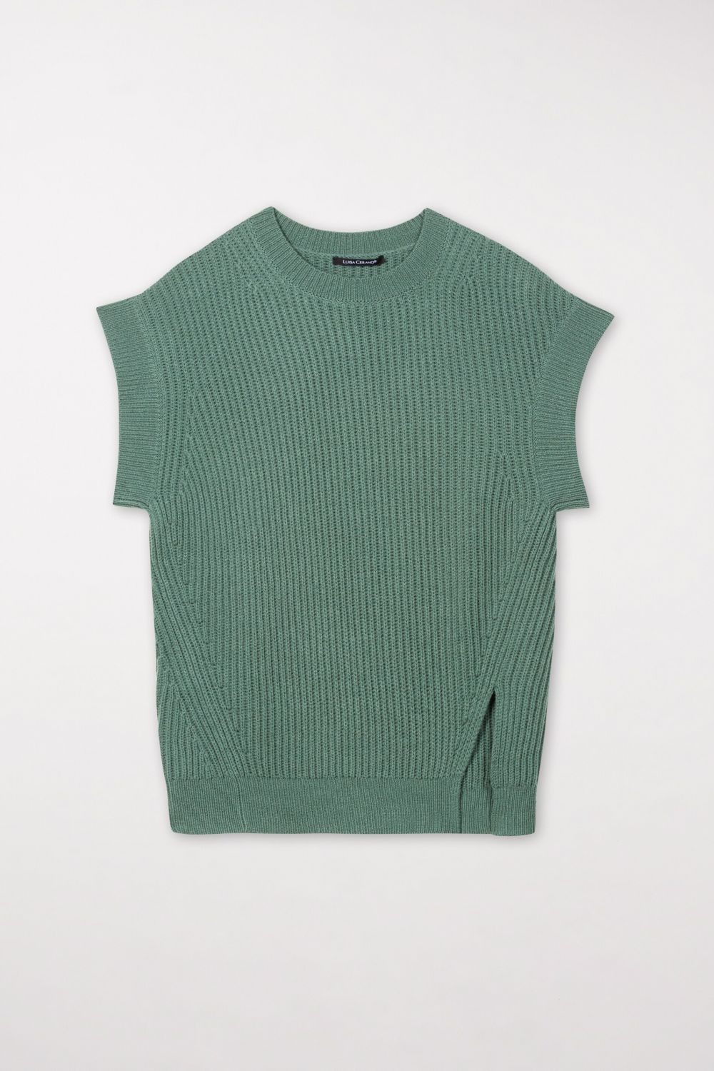 На сайте указаны российские размеры. Трикотажный жилет из легкой смесовой шерстяной резинки с воротником-стойкой, заниженной линией плеча и вязанным резинкой низом. Встроенные уменьшающиеся детали и асимметричные швы подчеркивают повседневный дизайн. Рост модели: 178 см.