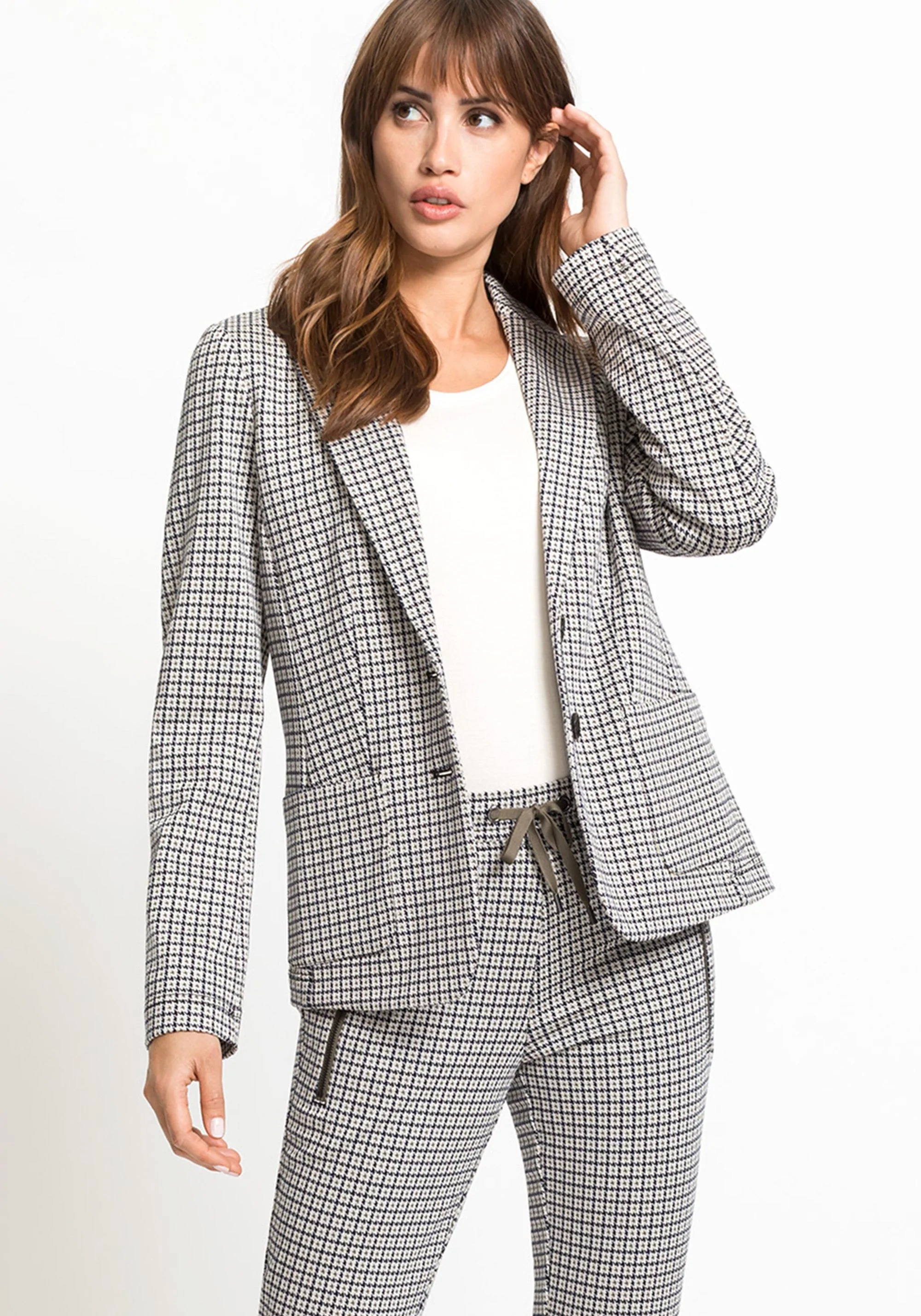 На сайте указаны российские размеры. Трикотажный жакет из джерси обеспечивает комфорт в течение всего дня, а классический узор «гусиная лапка» и индивидуальный внешний вид делают этот блейзер актуальным в этом сезоне. Сделайте свой образ деловым, надев свою любимую блузку и туфли-лодочки, или дополните его джинсами и кроссовками.