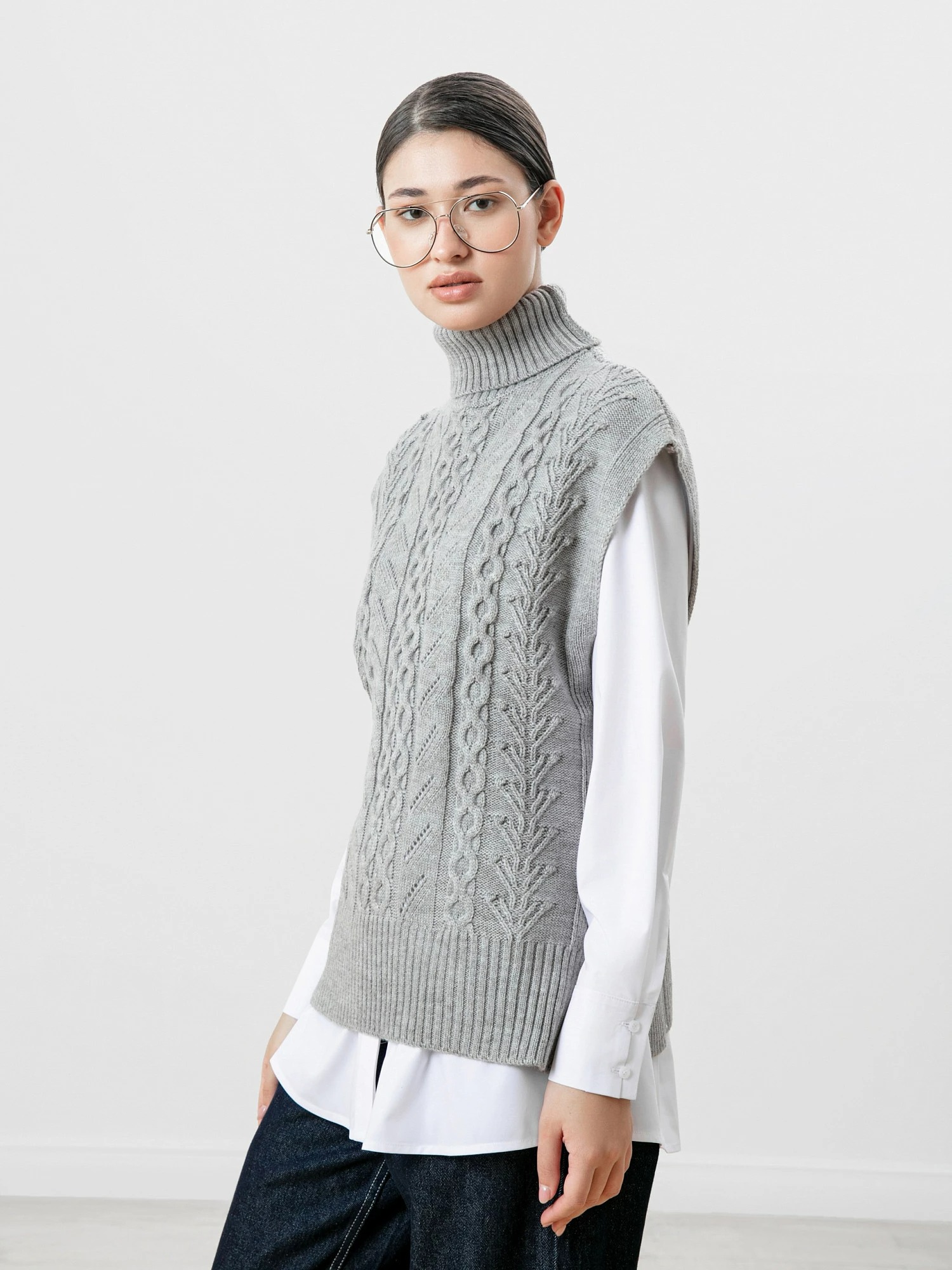 На сайте указаны российские размеры. Уютный жилет из фактурного вязаного трикотажа прямого свободного силуэта с широким воротником-стойка, резинкой и разрезами по низу. Прекрасная вещь для второго слоя при создании утепленных осенних образов. Рост модели на фото - 175 см.