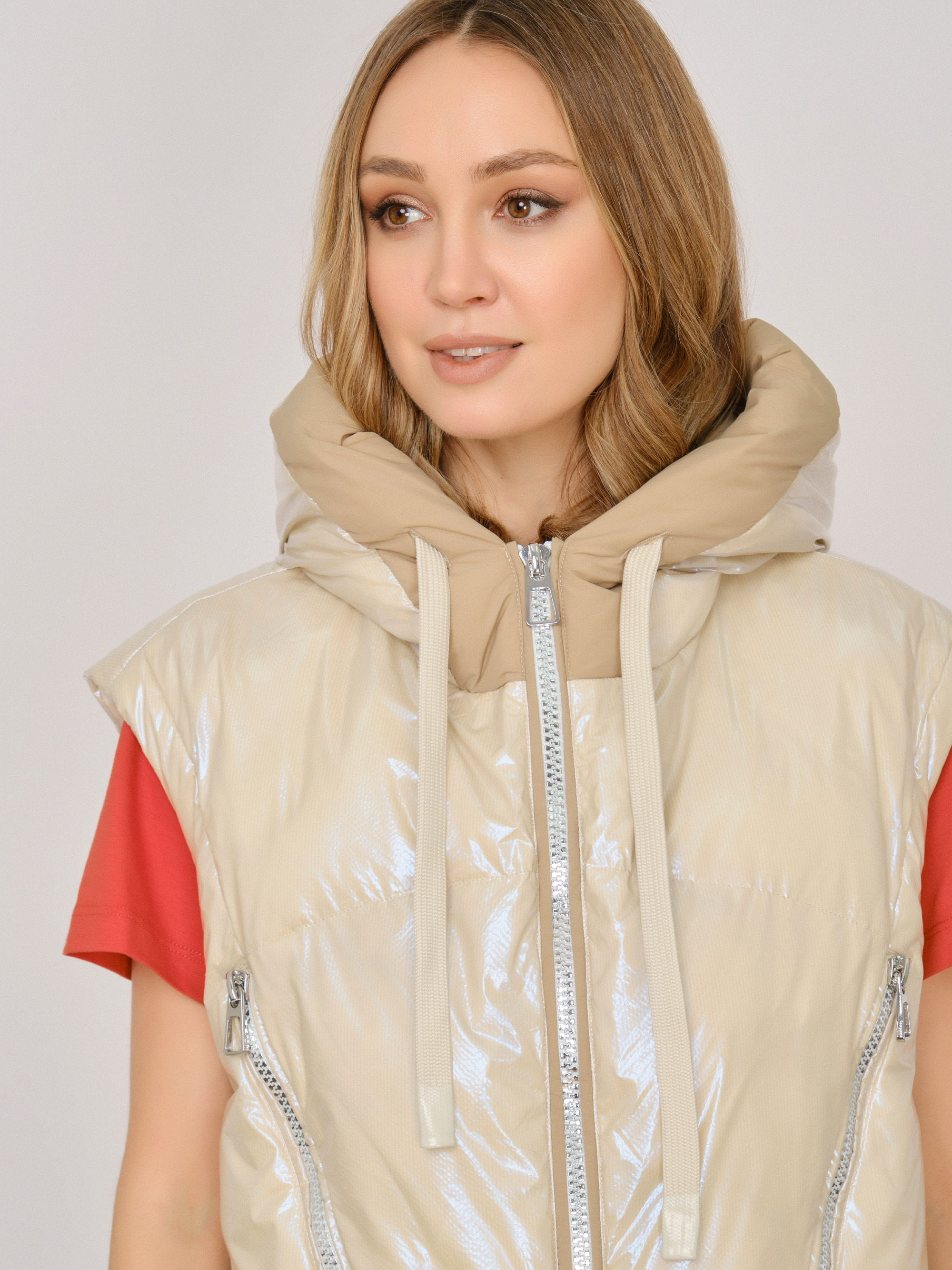 На сайте указаны российские размеры. Свободный светло-бежевый жилет на молнии, с капюшоном на завязках, с прорезными карманами и прорезными карманми на молнии, с боковыми разрезами на молнии и кулиской понизу. Длина по спинке: 68 см. Рост модели: 175 см.