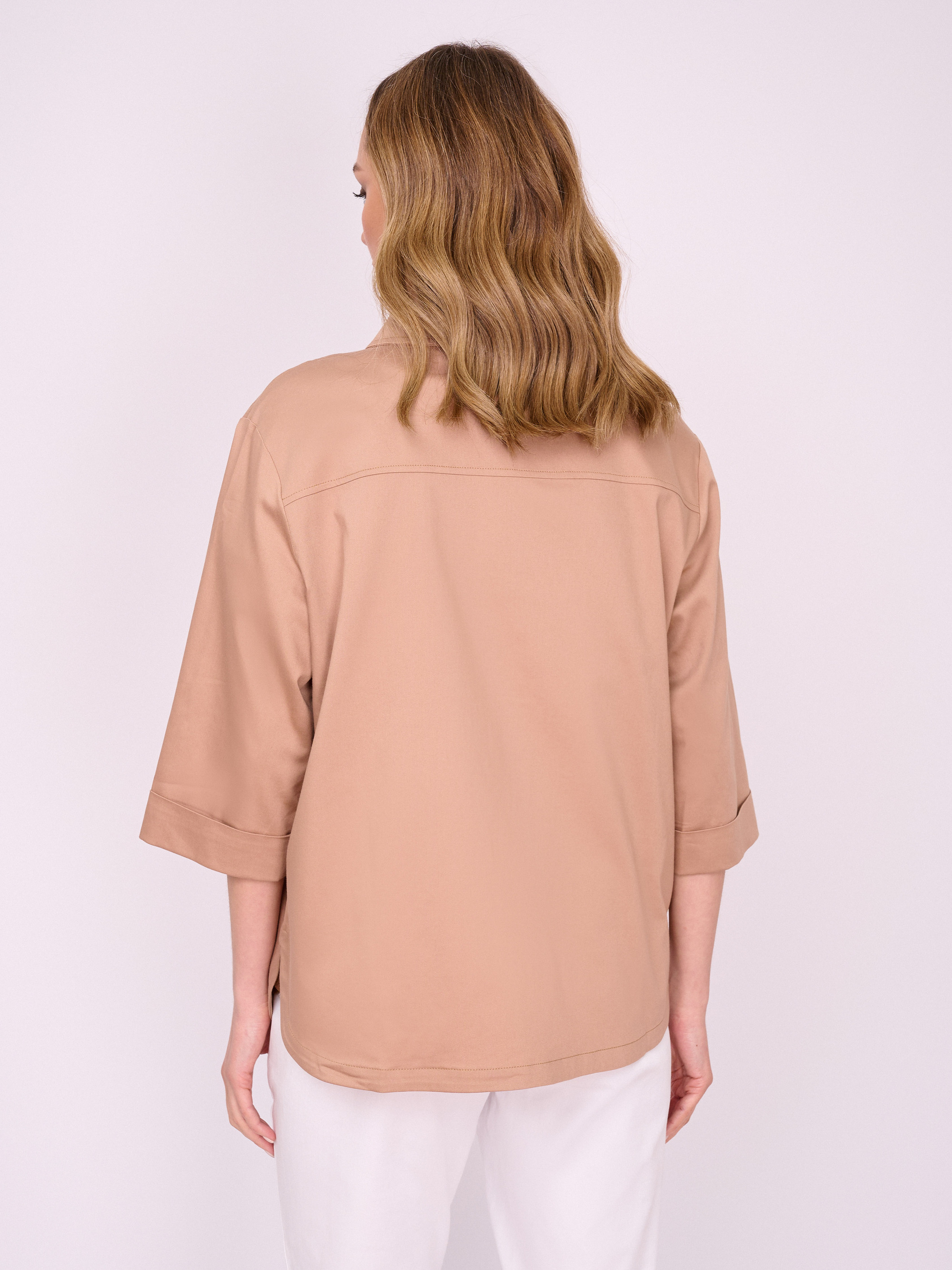 На сайте указаны российские размеры. Бежевый жакет трапеция на пуговицах, с отложным воротником, с накладными карманами, с рукавом 7/8, со стразами, с боковыми разрезами. Длина по спинке: 67 см. Рост модели: 175 см.