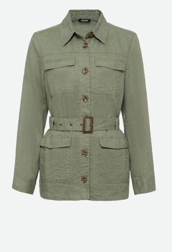 На сайте представлены Российские размеры. Жакет с воротником и планкой на пуговицах по всей длине, а также особая деталь на поясном ремне с большой черепаховой пряжкой делают эту куртку по-настоящему эффектной. Четыре накладных кармана с клапанами дополняют жакет.