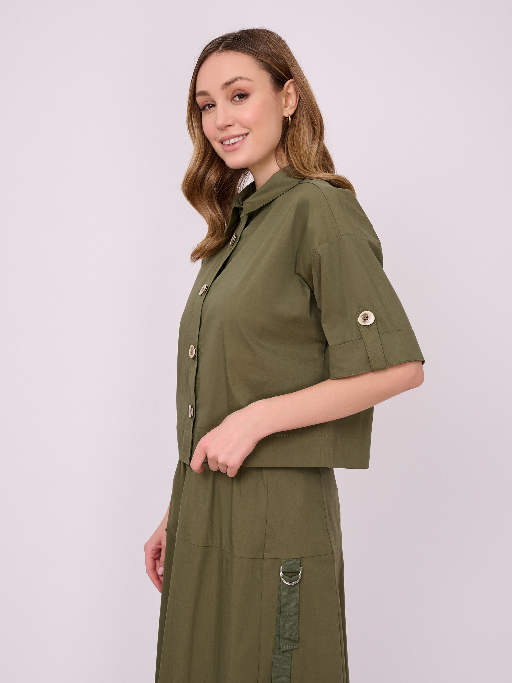 На сайте указаны российские размеры. Укороченный жакет рубашечного покроя на пуговицах с отложным воротником, короткими рукавами с поворотами, накладным карманом на груди. Длина по спинке: 51 см. Рост модели 175 см.